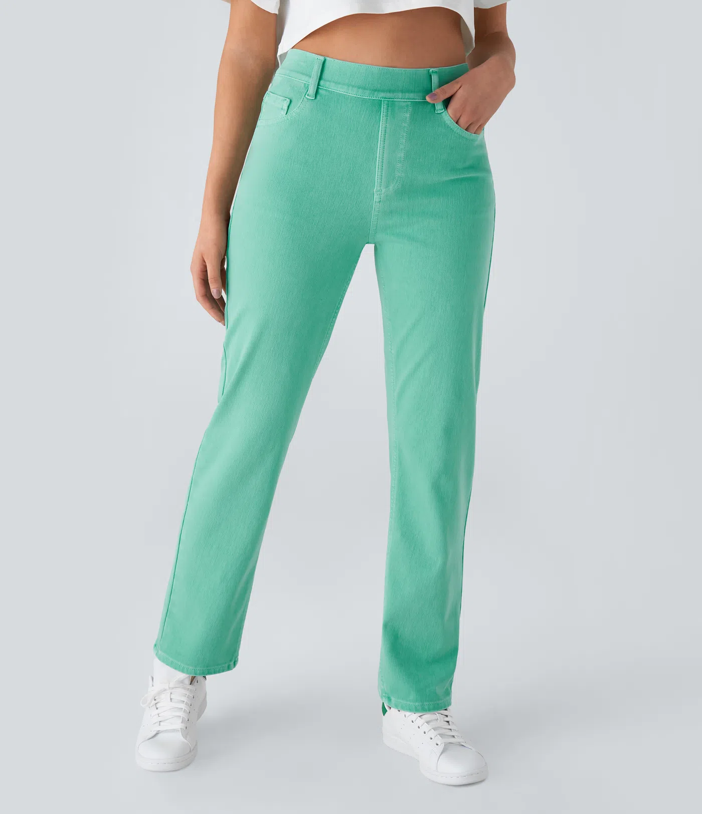 High Waisted Multiple Pockets Straight Leg Colorful Stretchy Knit Casual Jeans