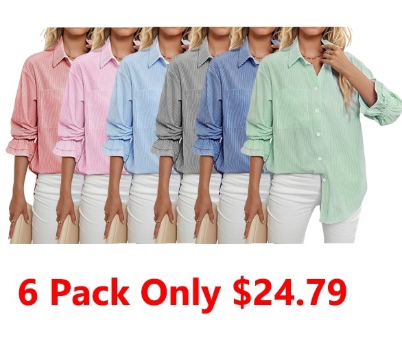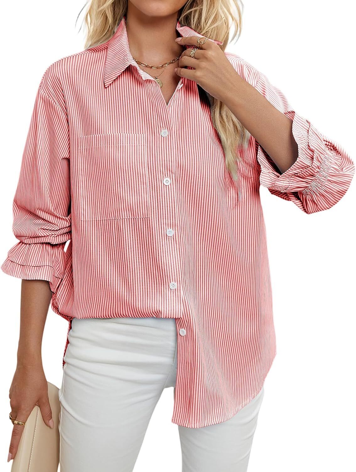 Women's Striped Button Down Shirts Smocked Cuffed Boyfriend Shirt Long Sleeve Blouse Top with 3 Pockets