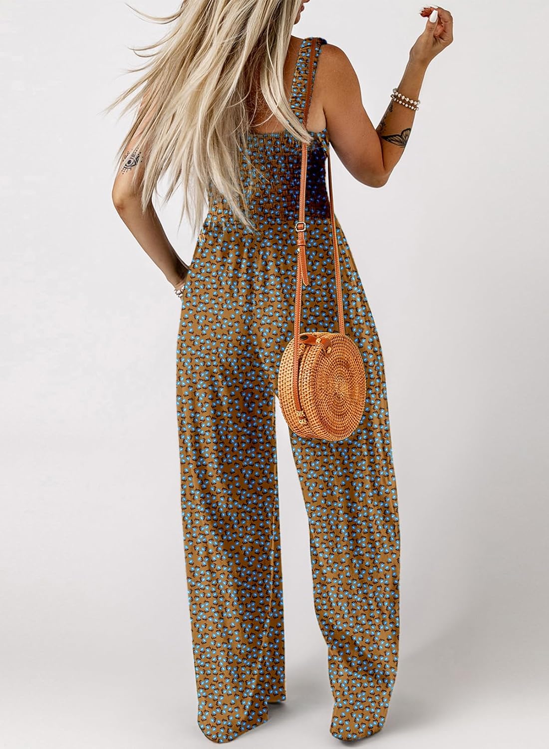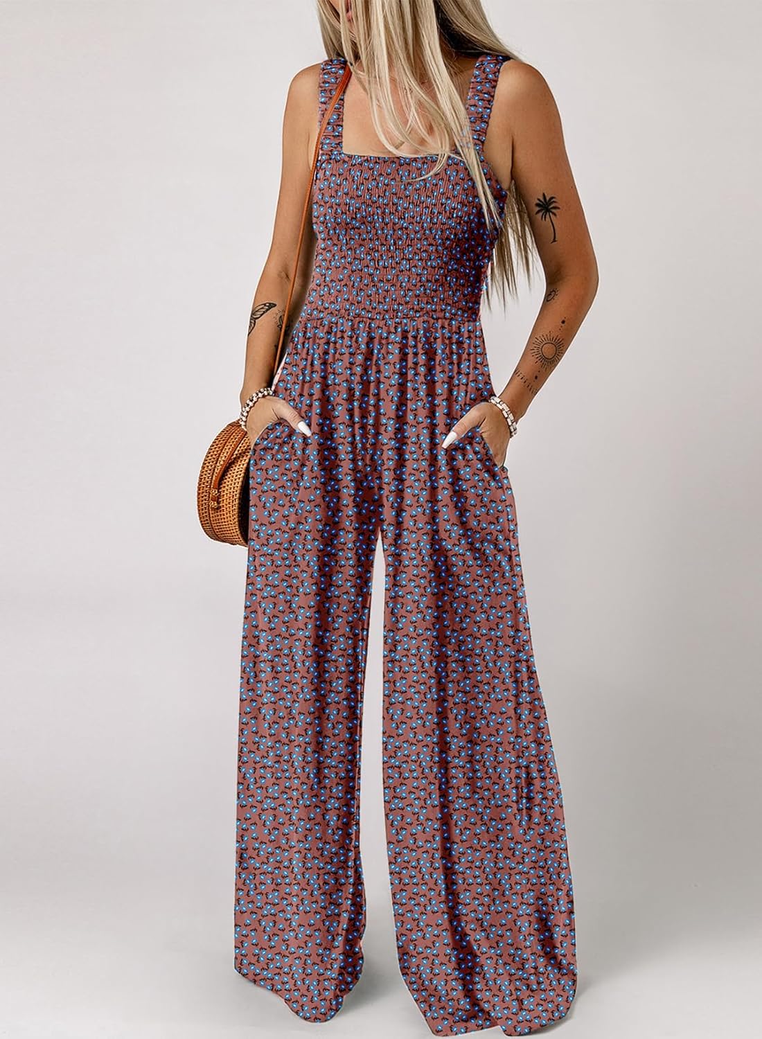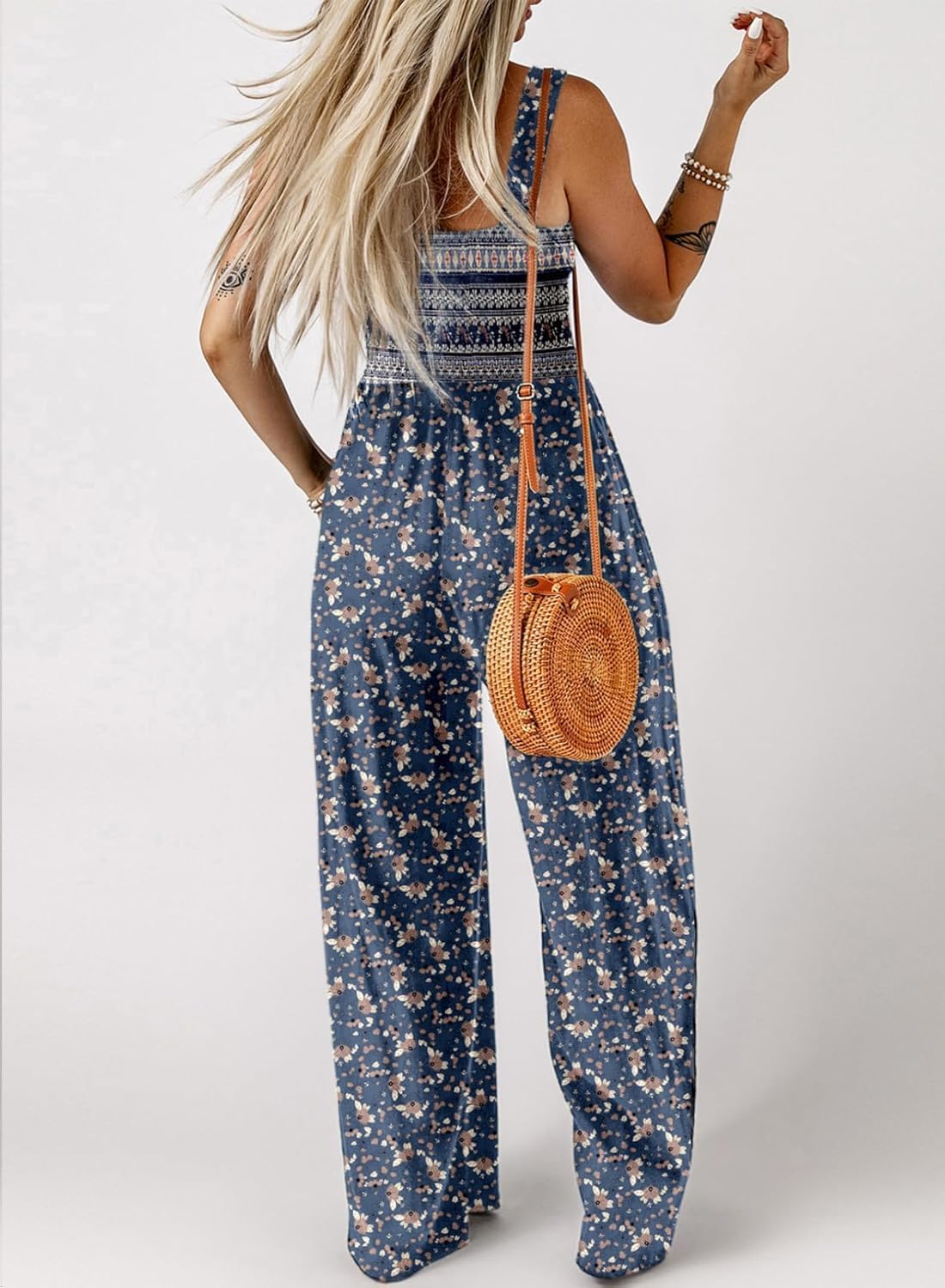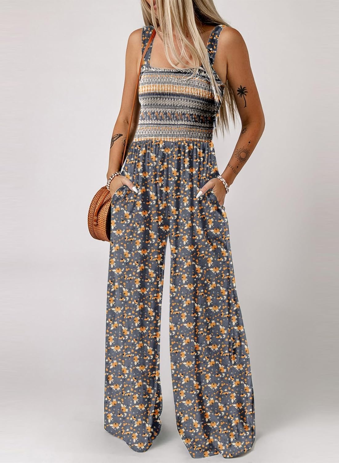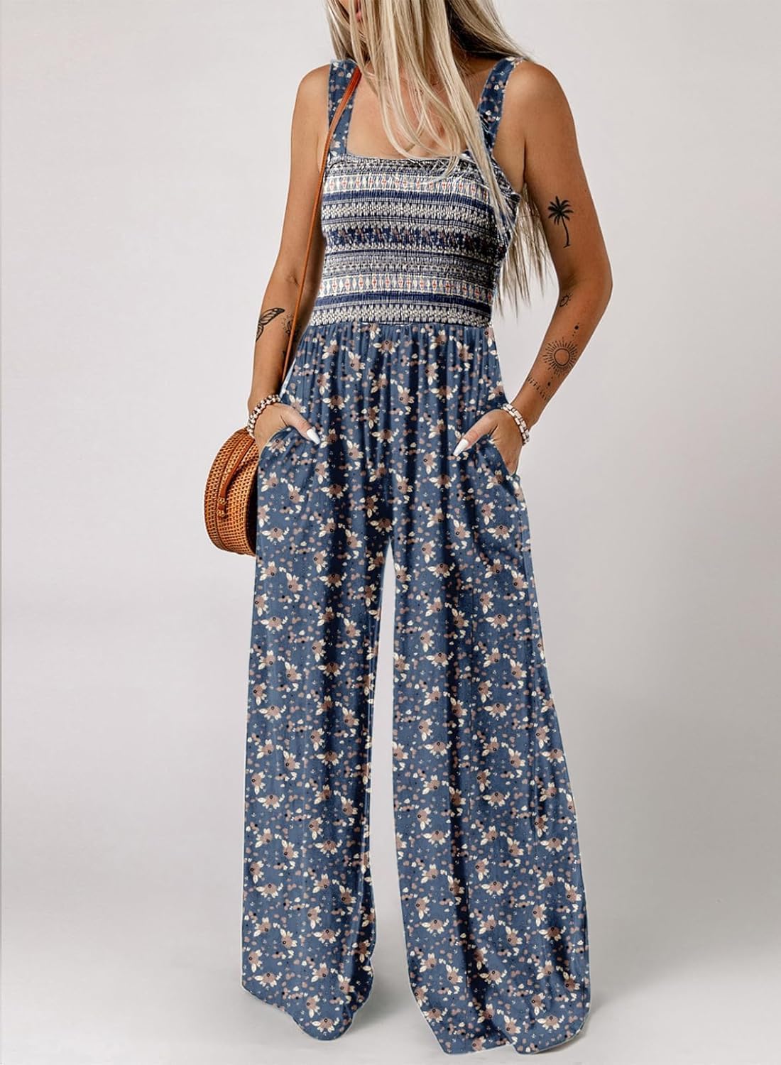Womens Wide Leg One Piece Sleeveless Printed Jumpsuit Long Pant Rompers