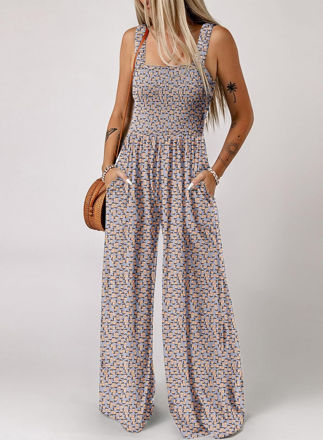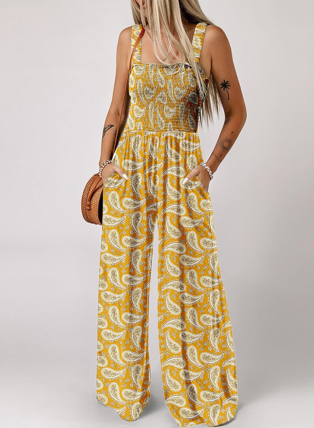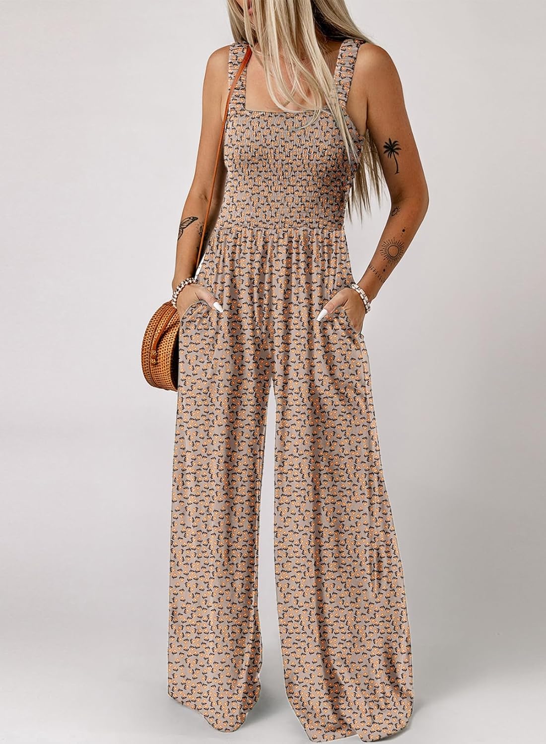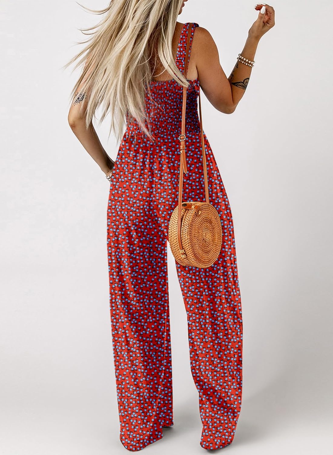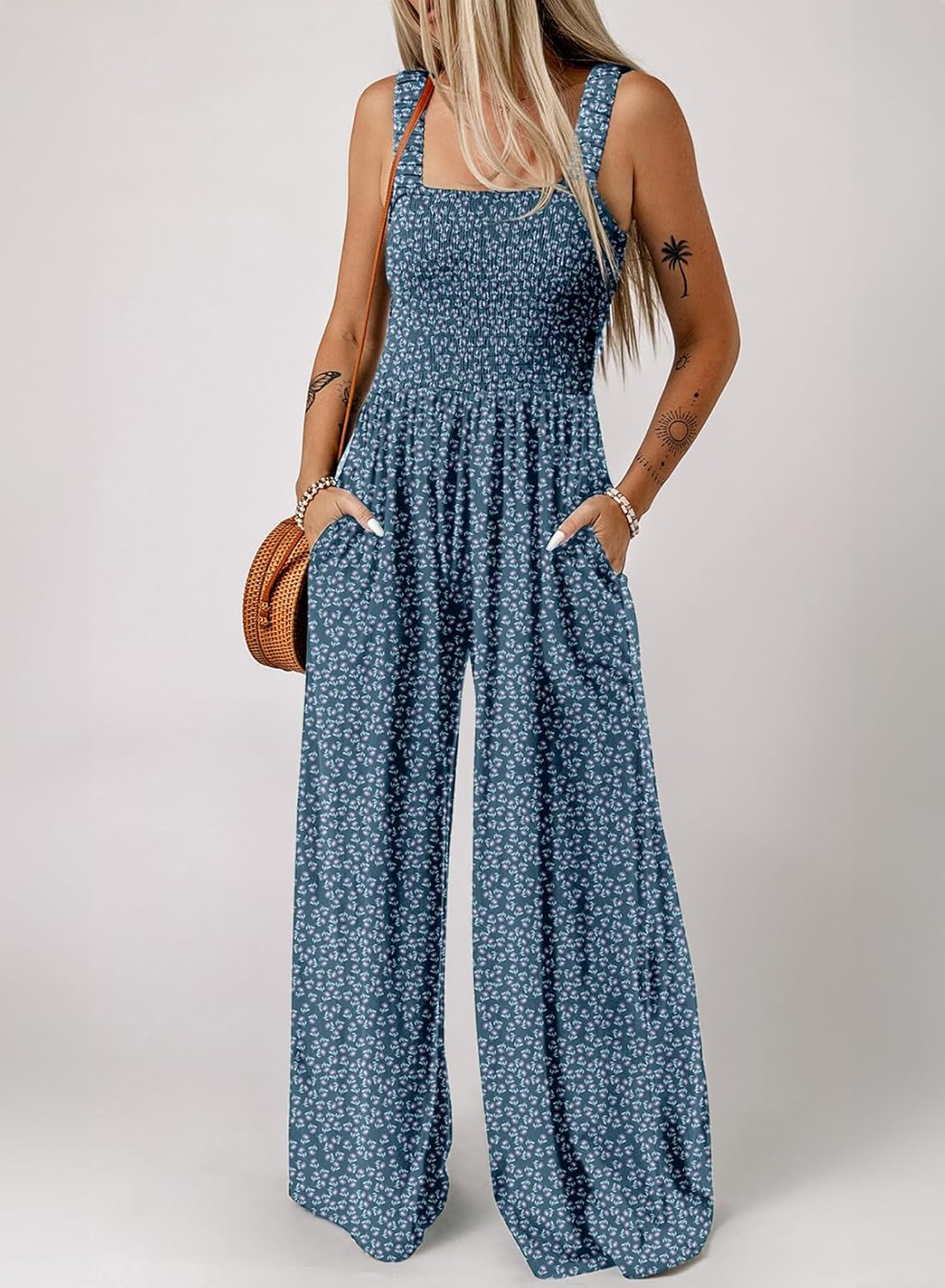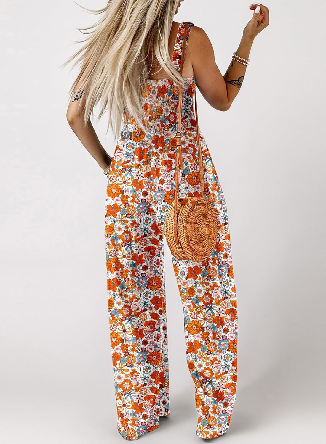 Womens Wide Leg One Piece Sleeveless Printed Jumpsuit Long Pant Rompers