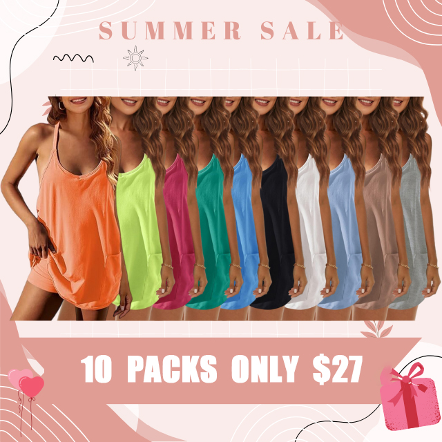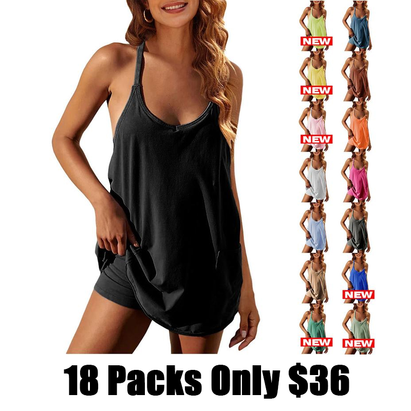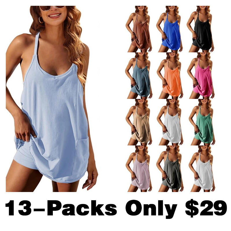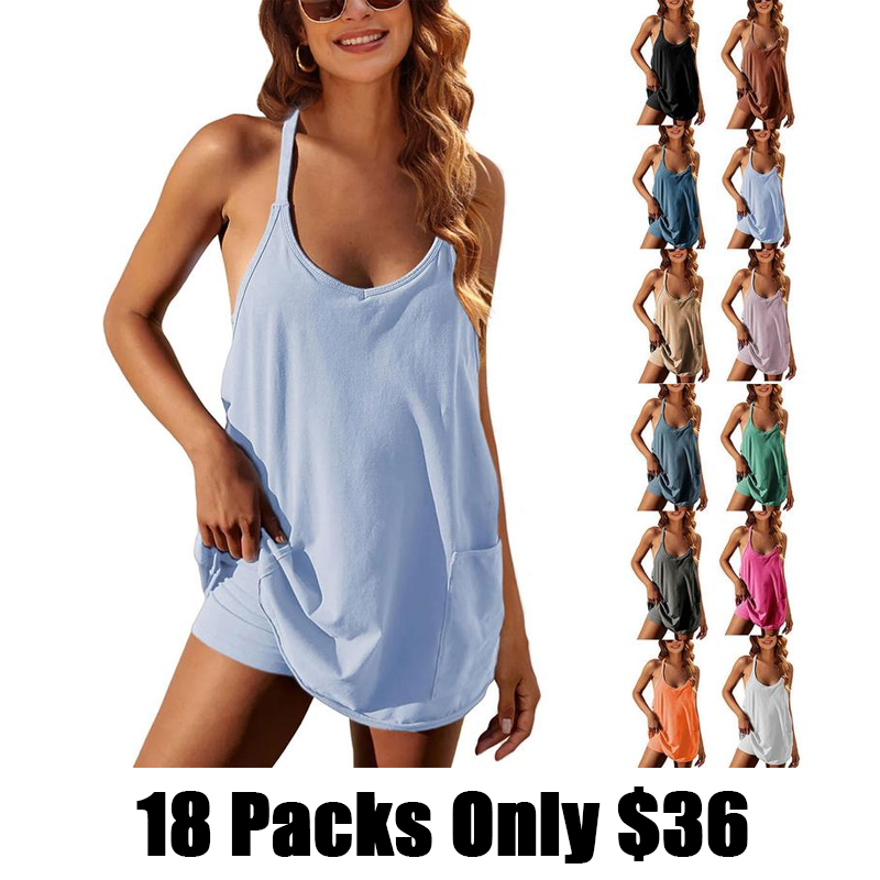 Feature: Scoop neckline, mini-length, two oversized patch pockets at front, thin shoulder straps, sleeveless mini dress for women with built-in shorts,solid color workout mini dress