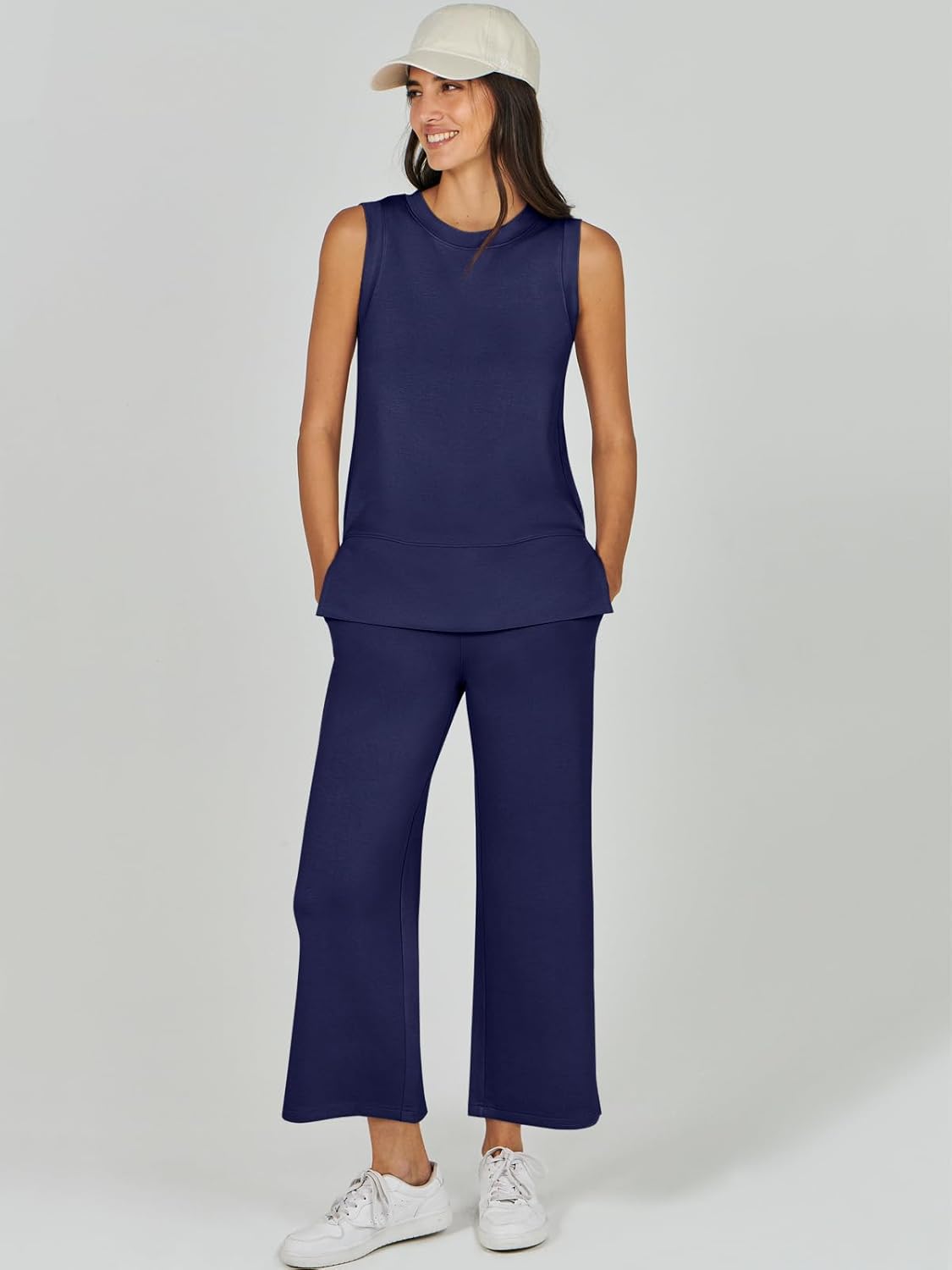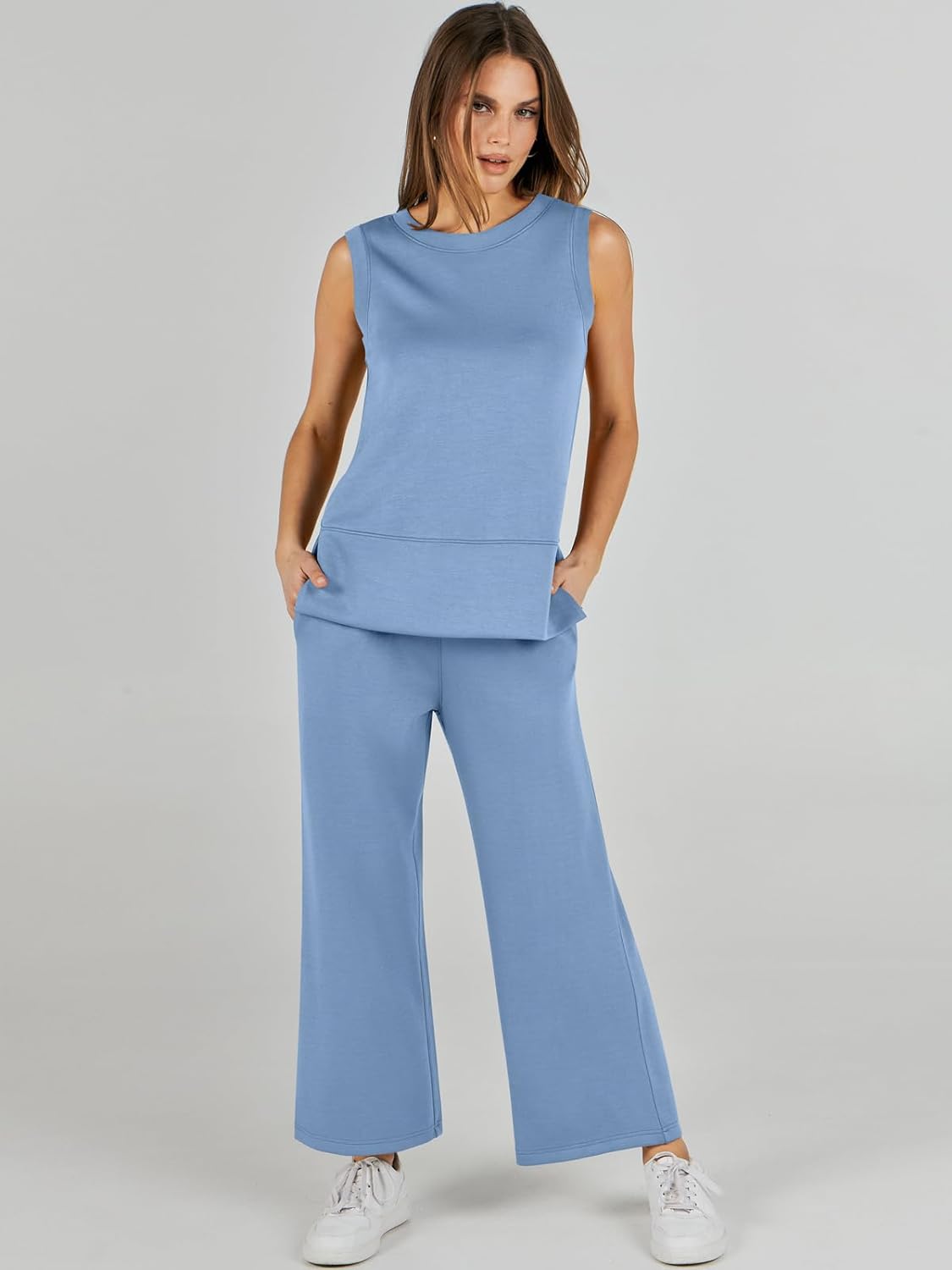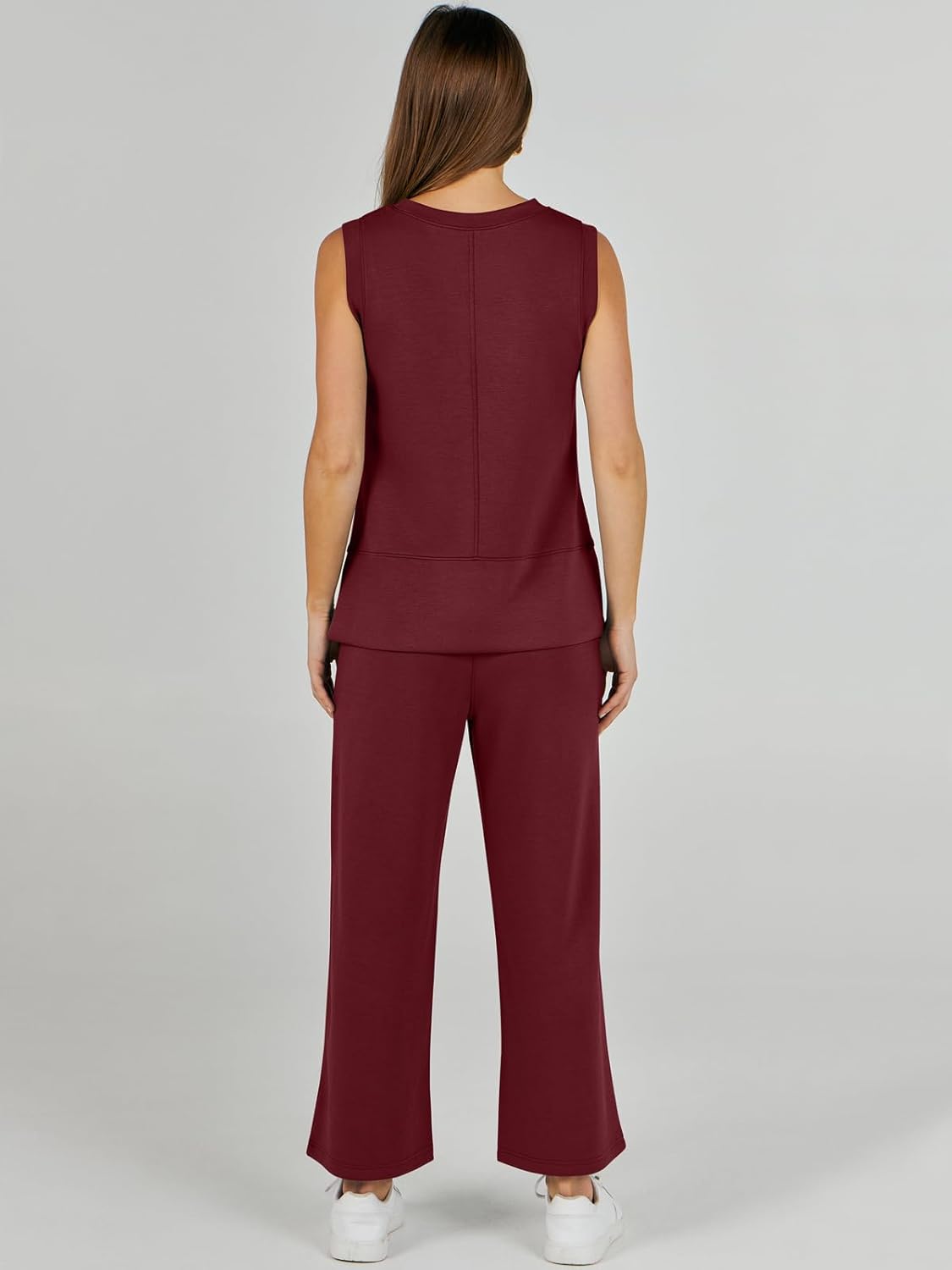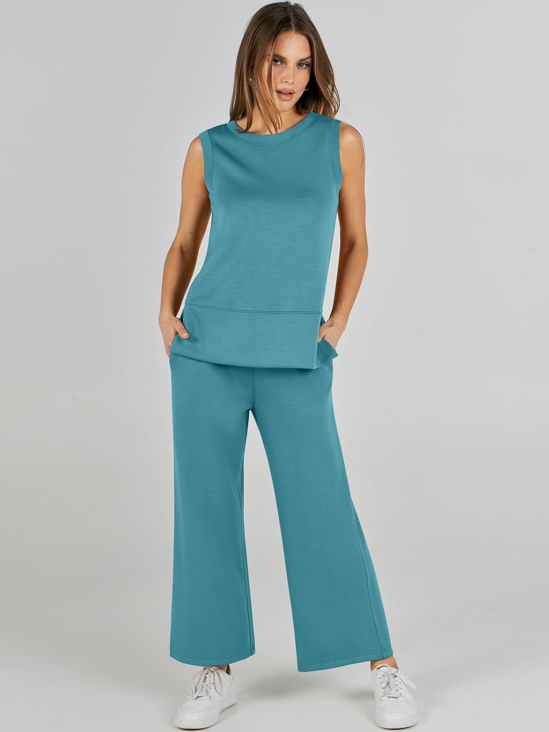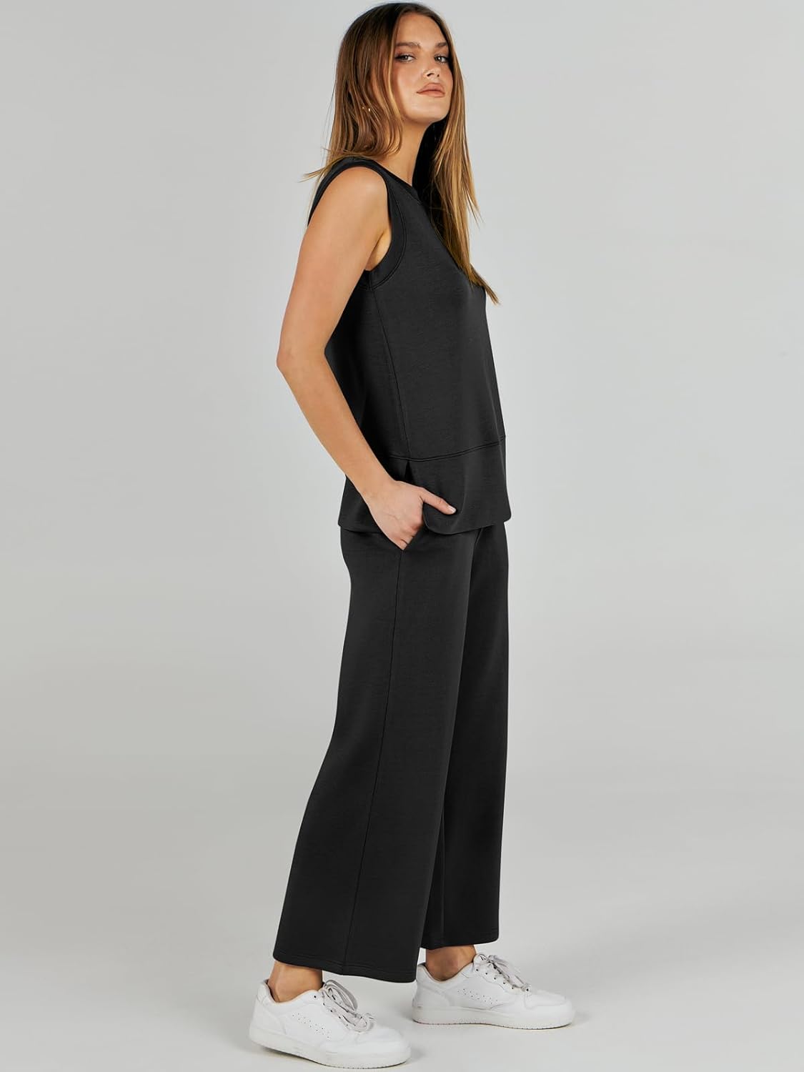 Feature --- Crewneck / Sleeveless / High Waist / Drawstring/ Wide Leg