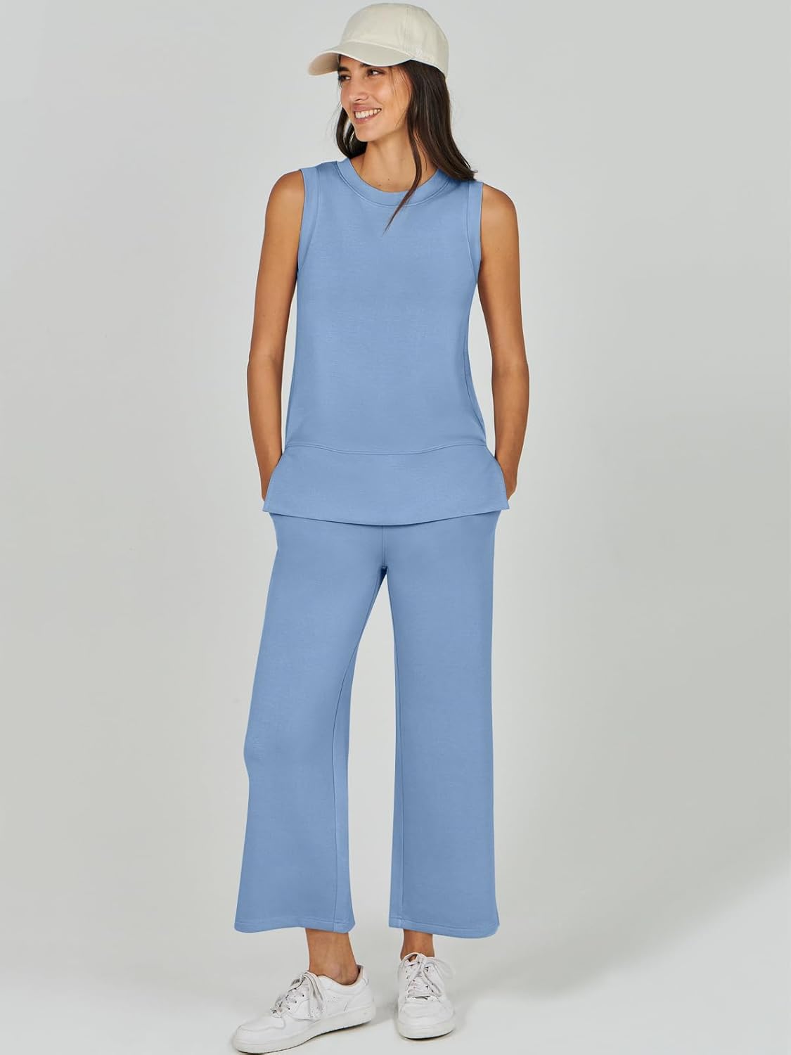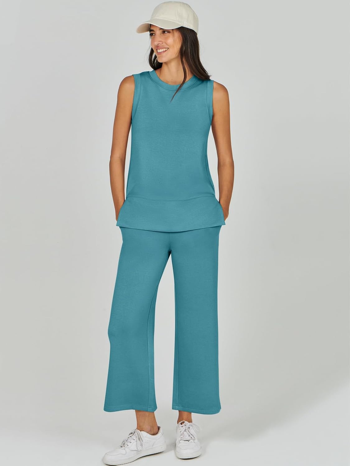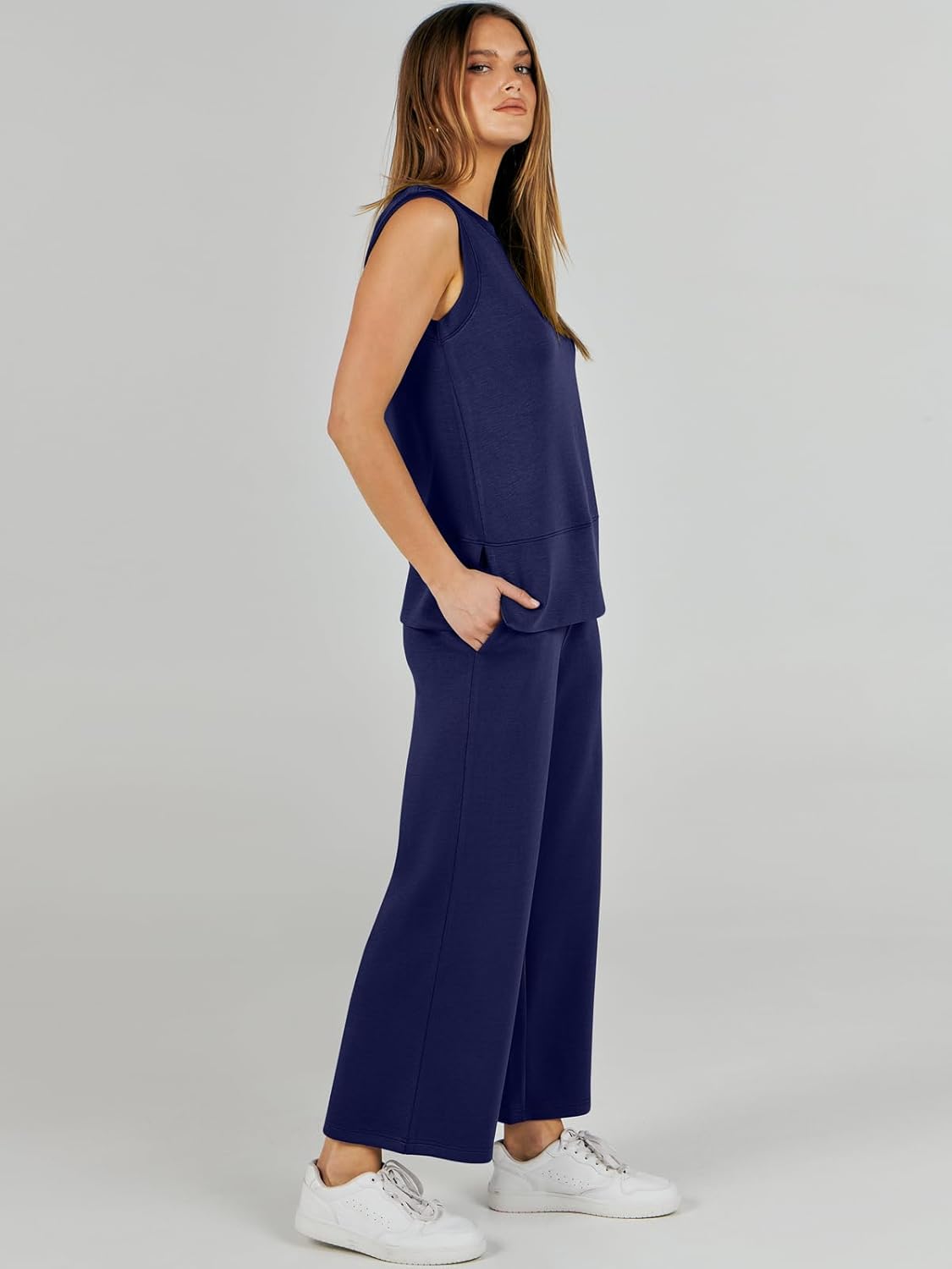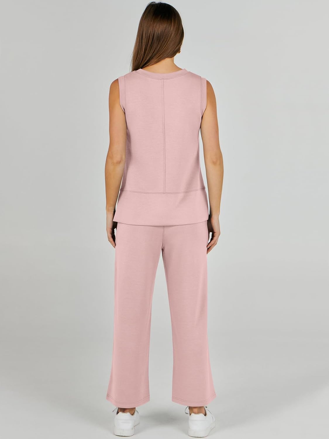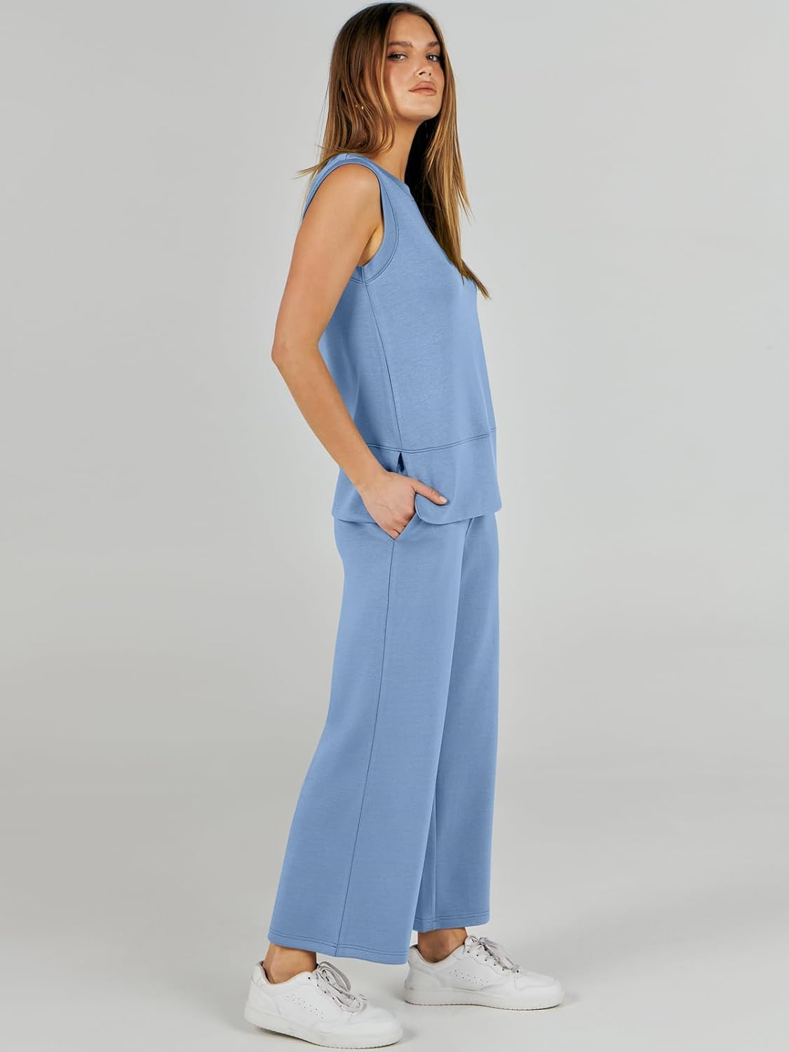 Feature --- Crewneck / Sleeveless / High Waist / Drawstring/ Wide Leg
