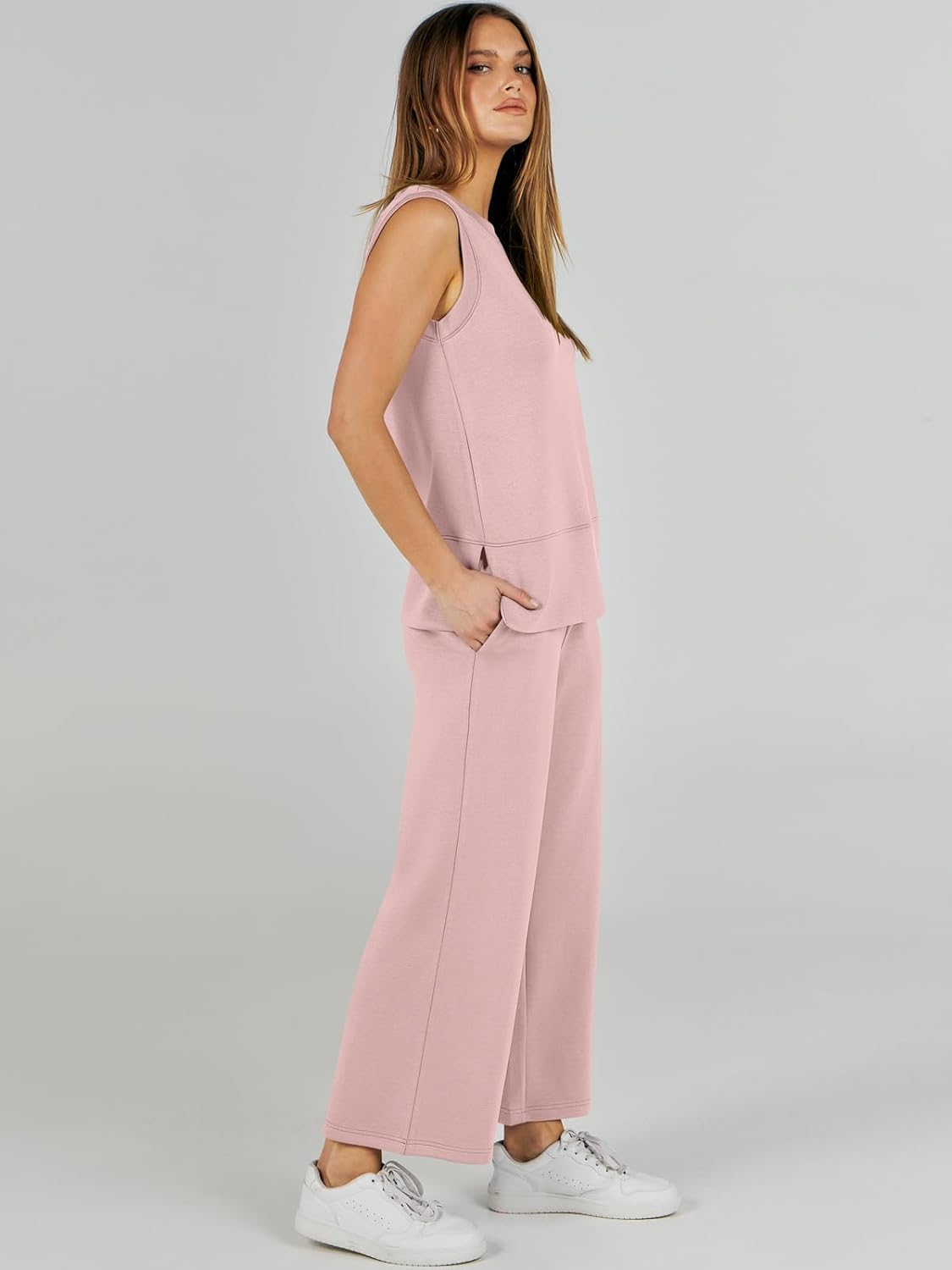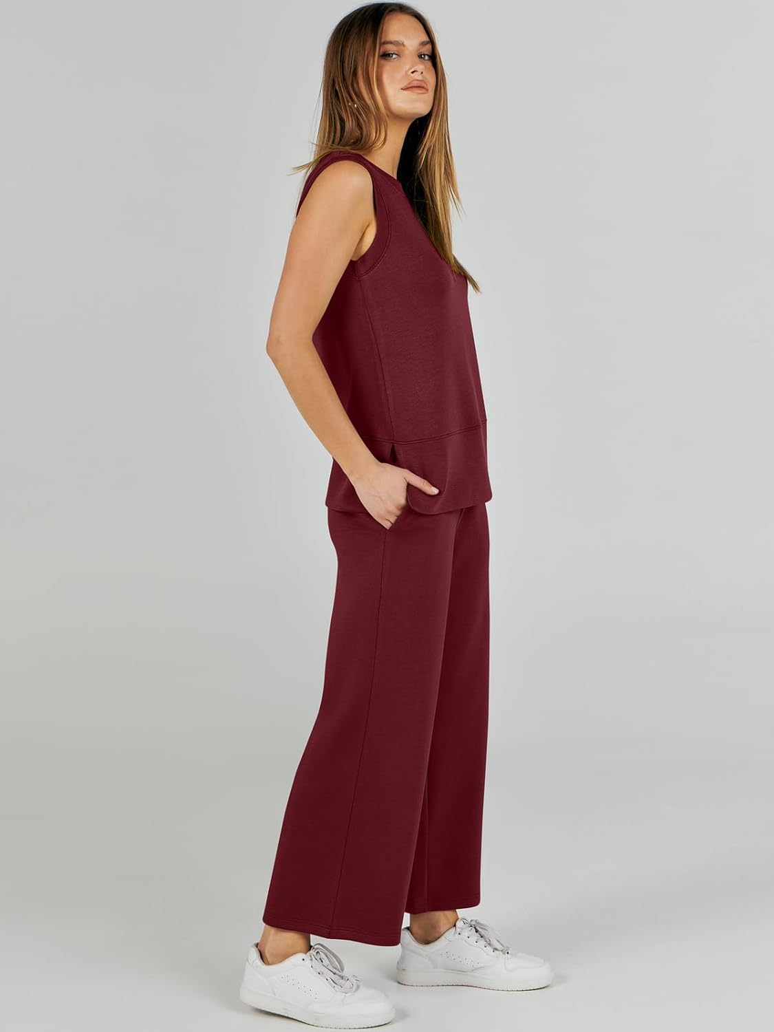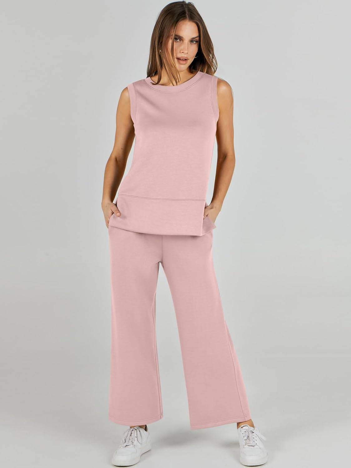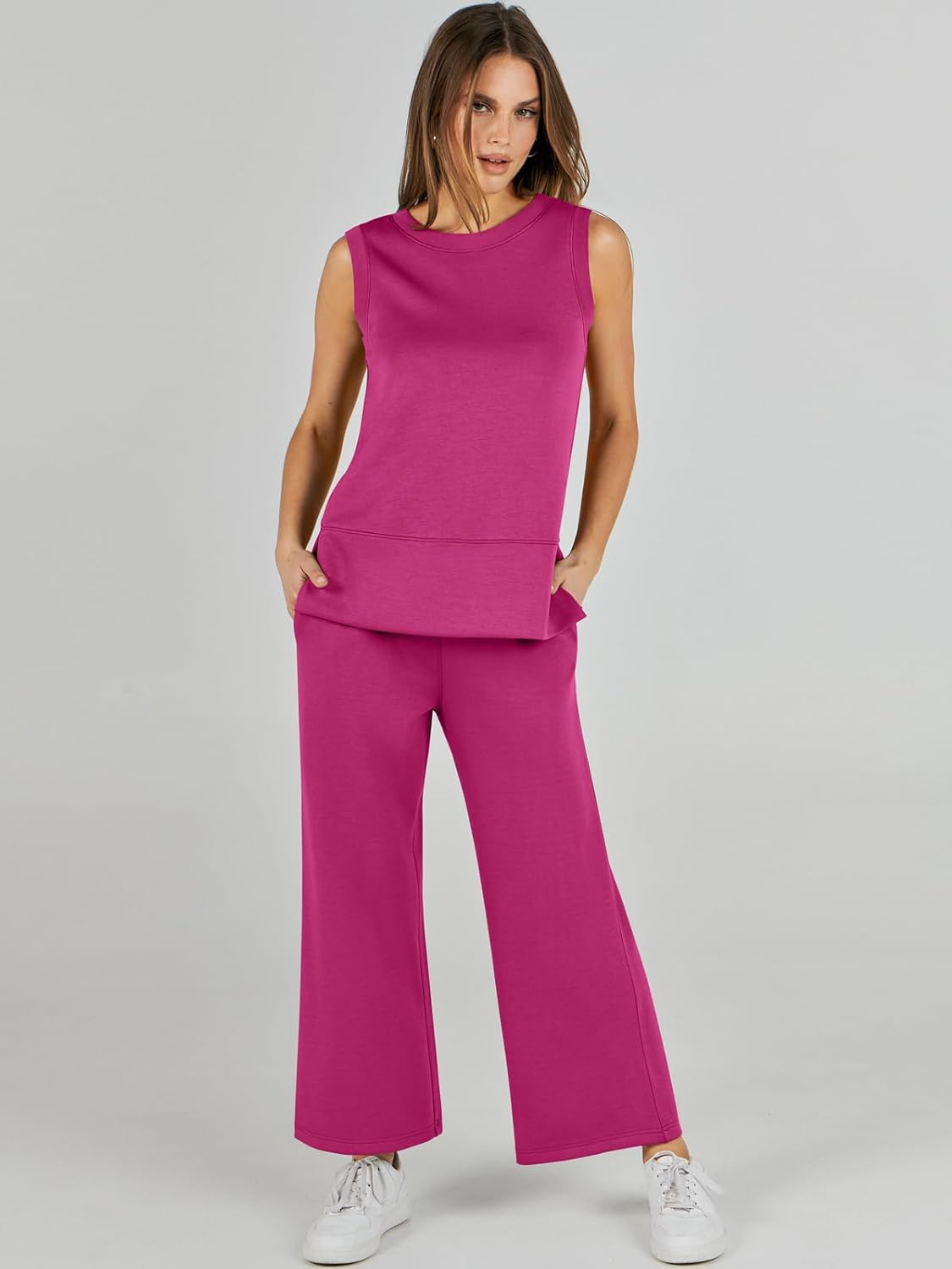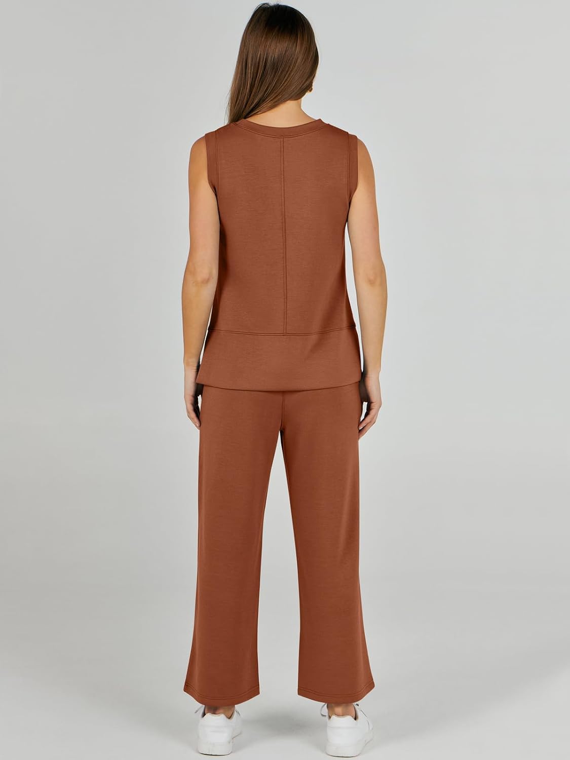 Feature --- Crewneck / Sleeveless / High Waist / Drawstring/ Wide Leg