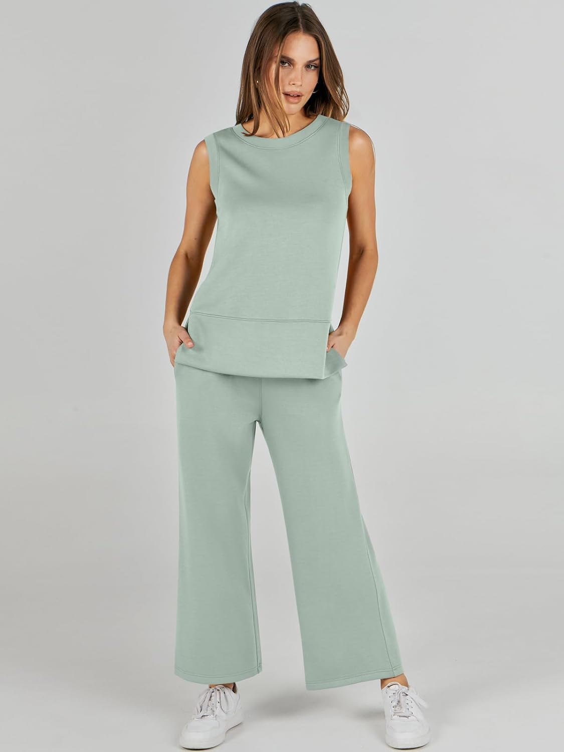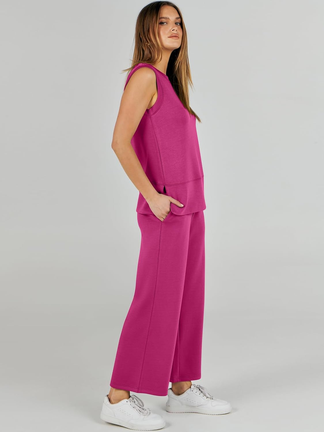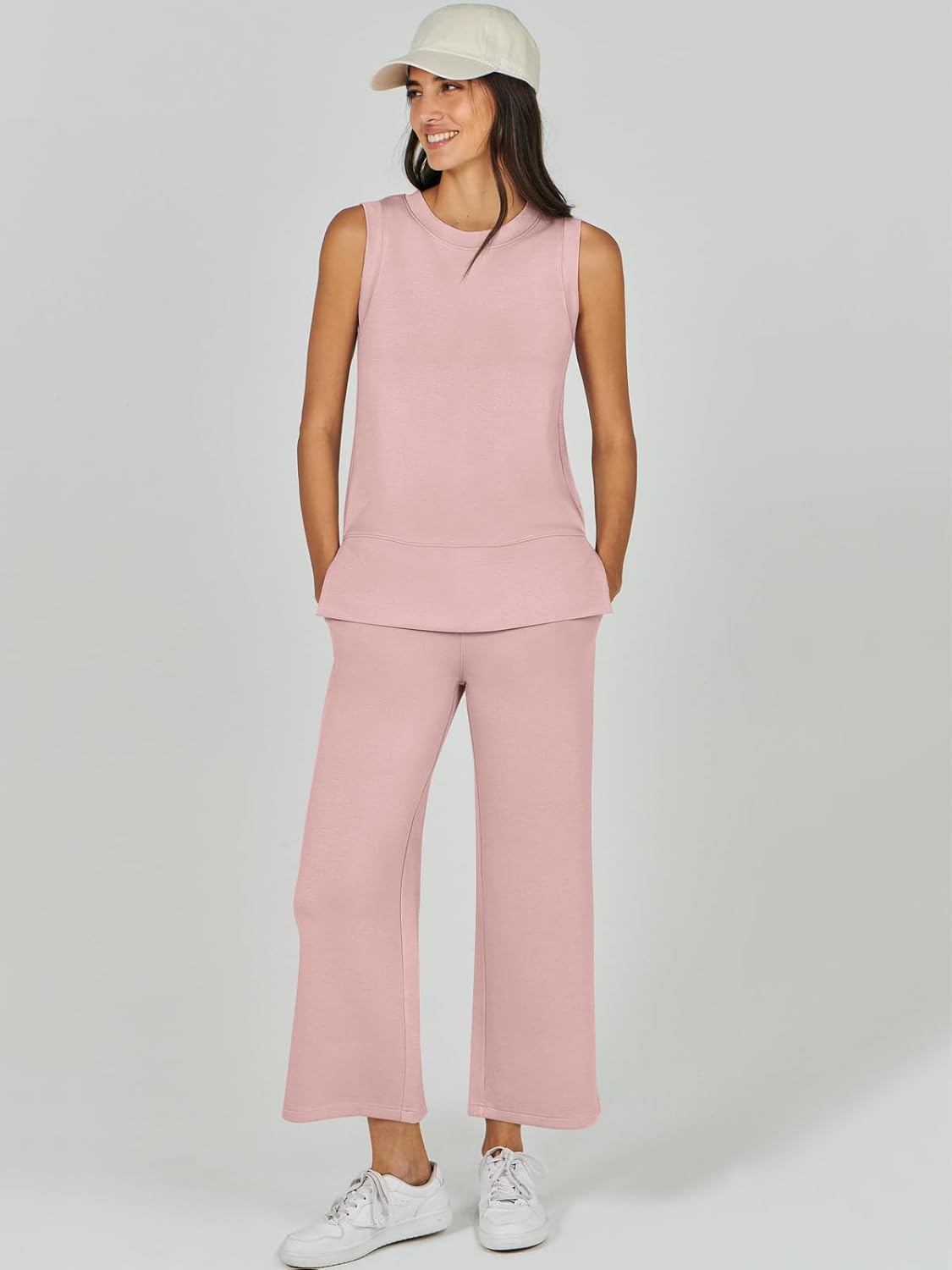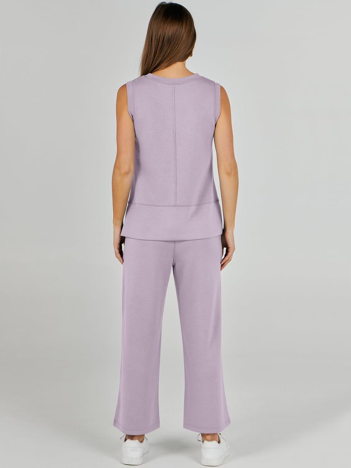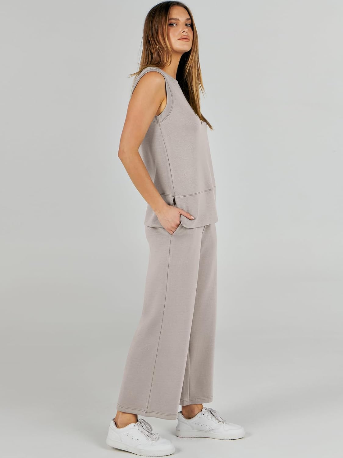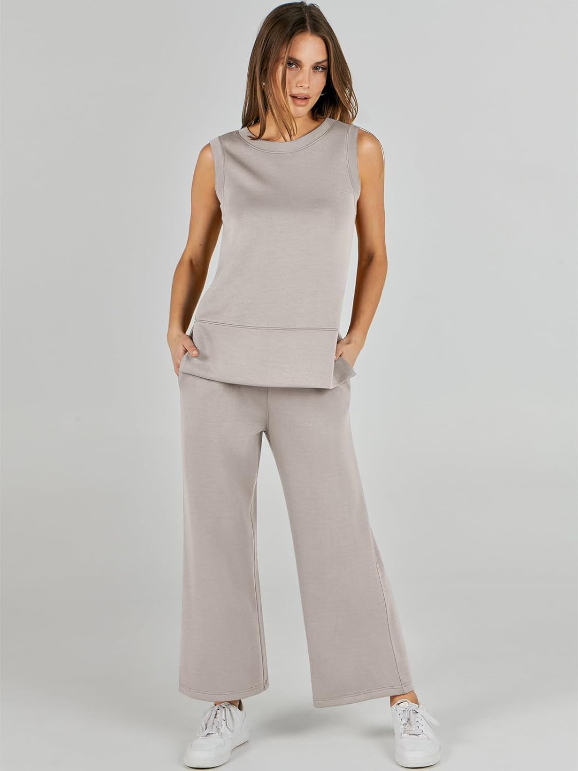 Feature --- Crewneck / Sleeveless / High Waist / Drawstring/ Wide Leg