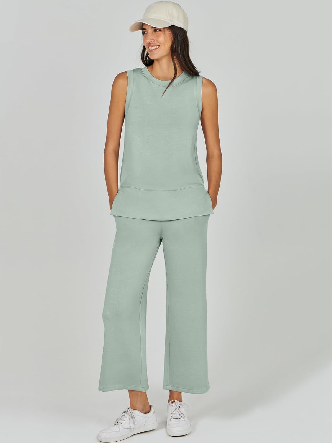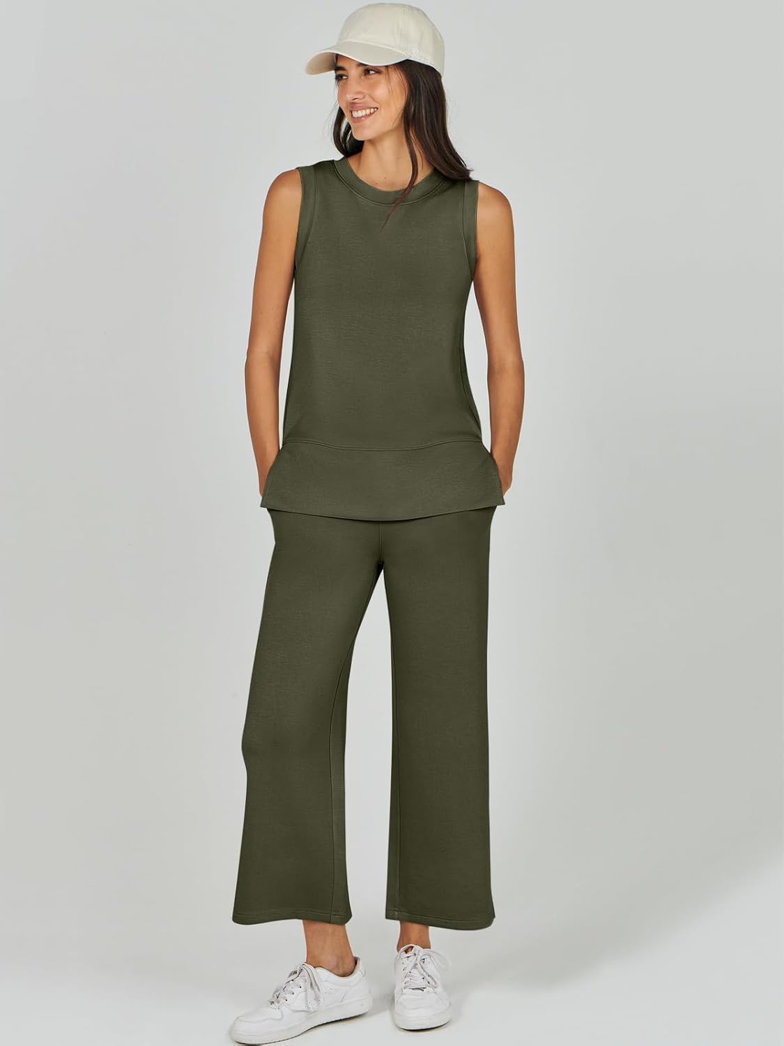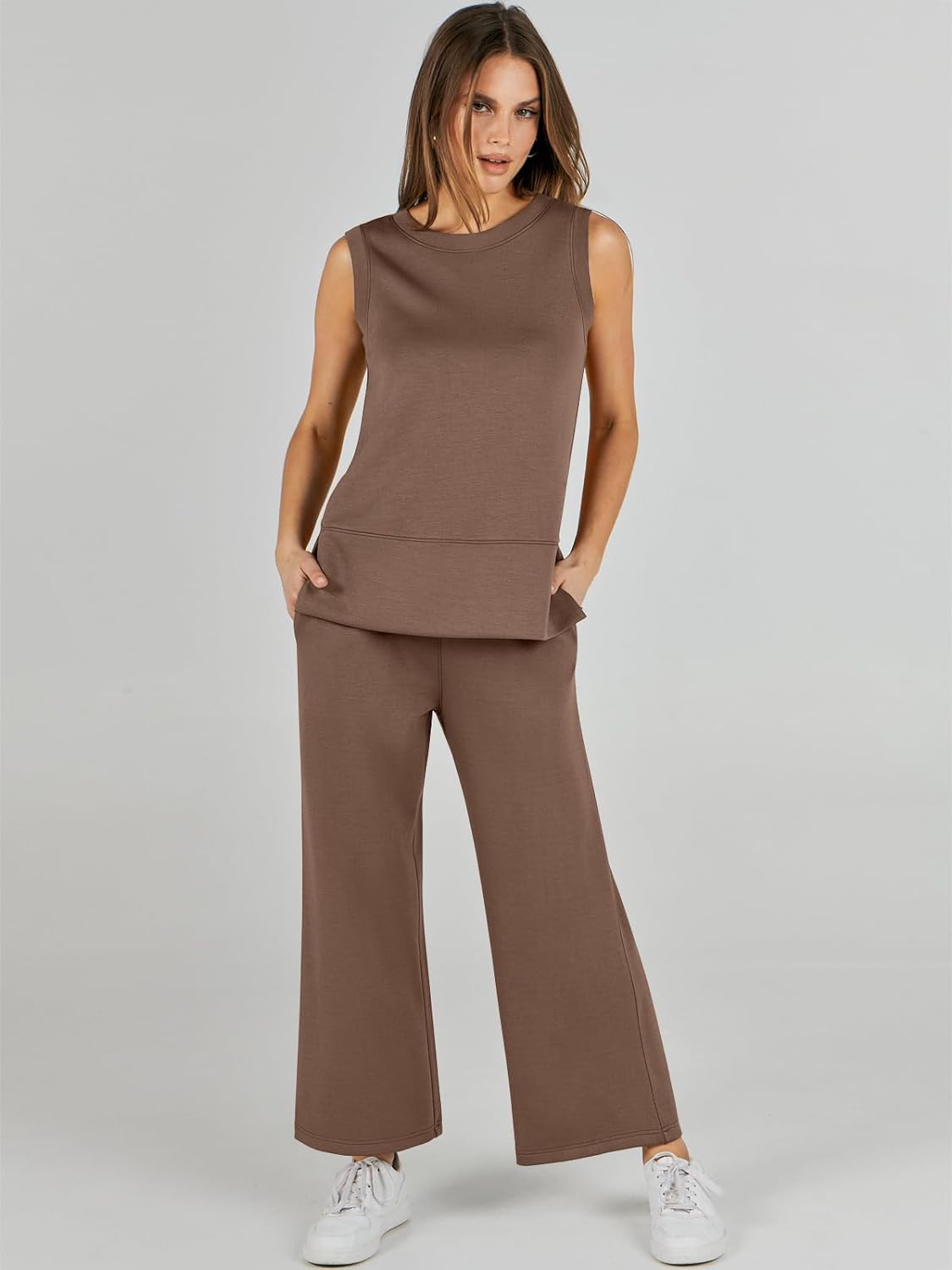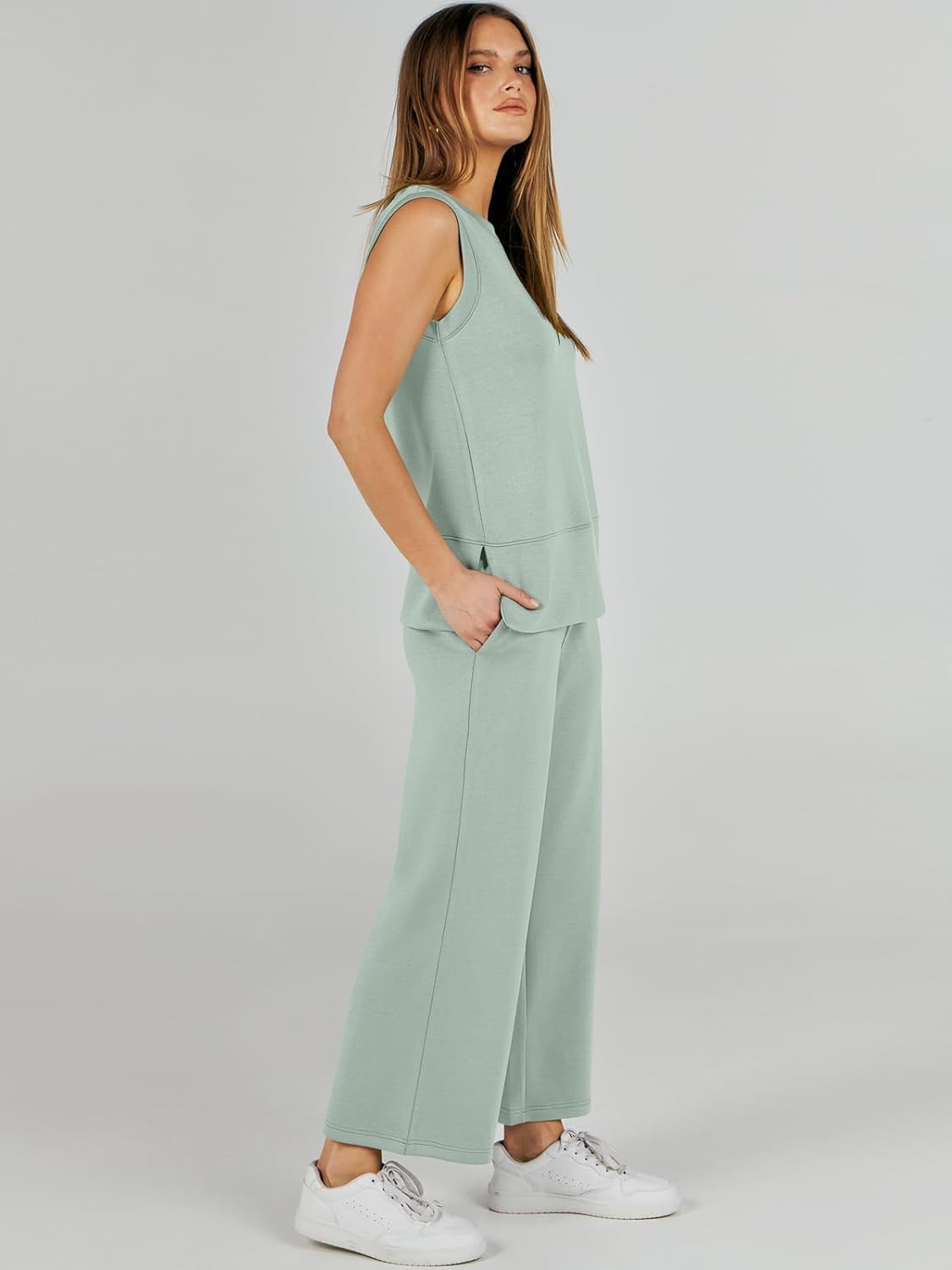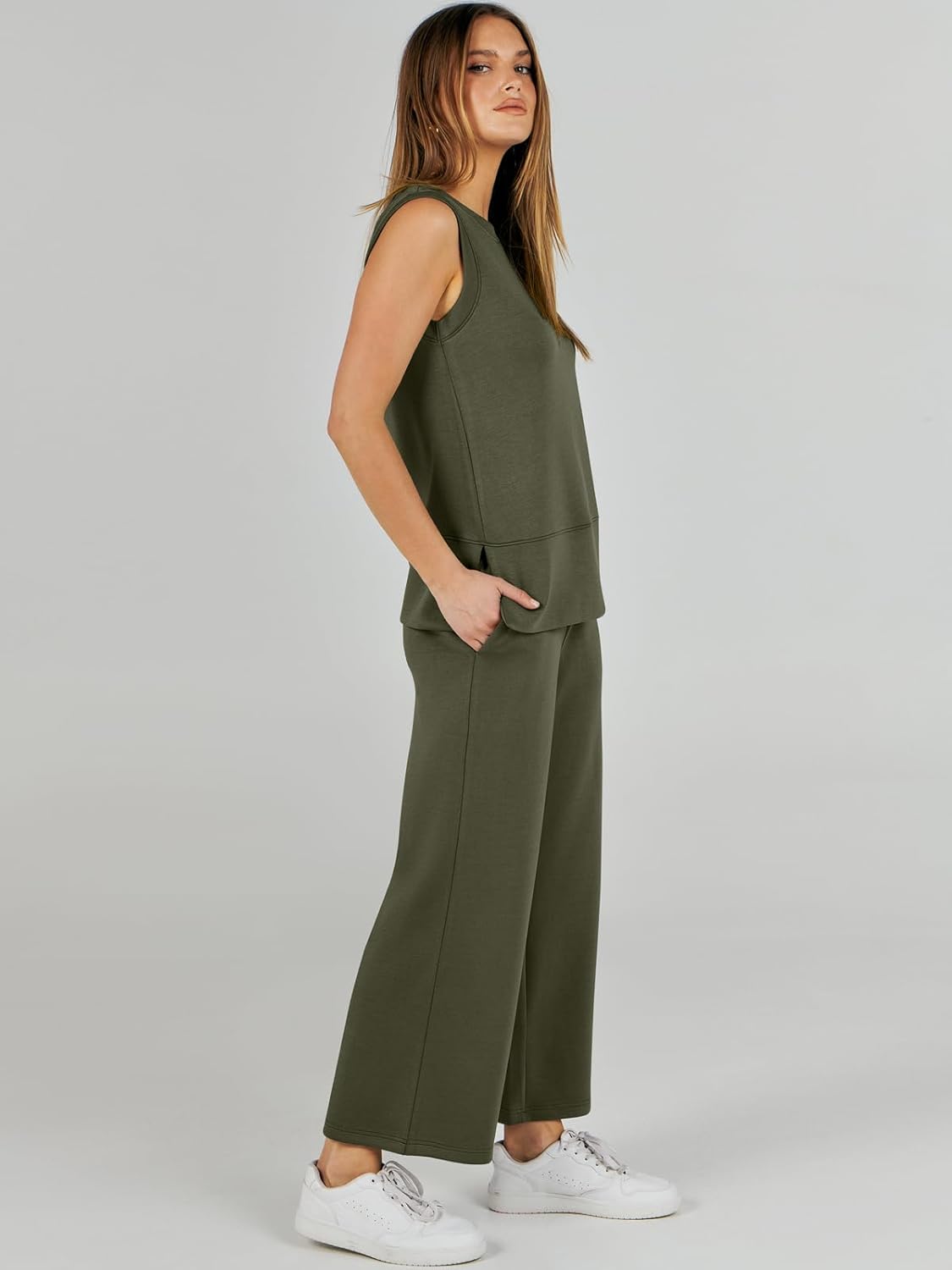 Feature --- Crewneck / Sleeveless / High Waist / Drawstring/ Wide Leg
