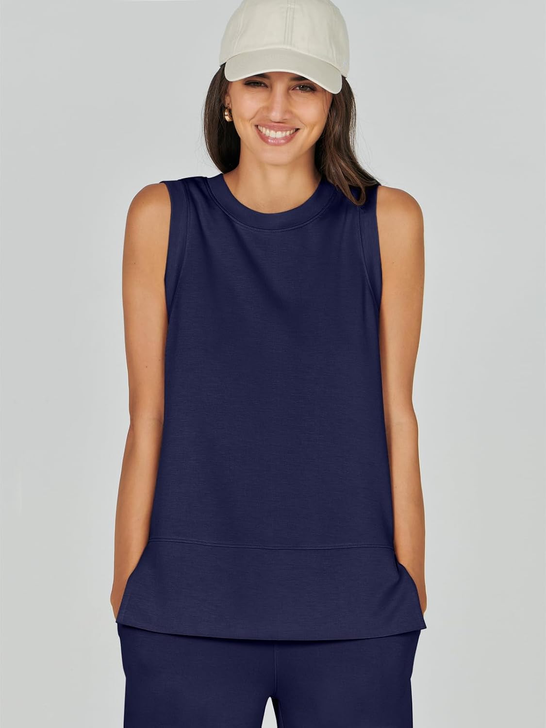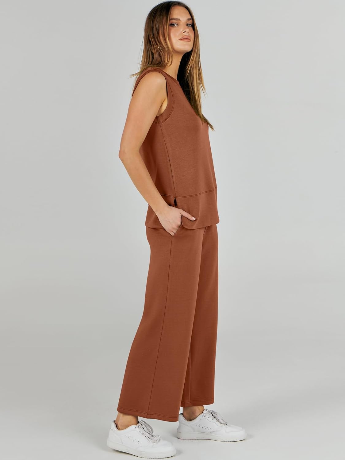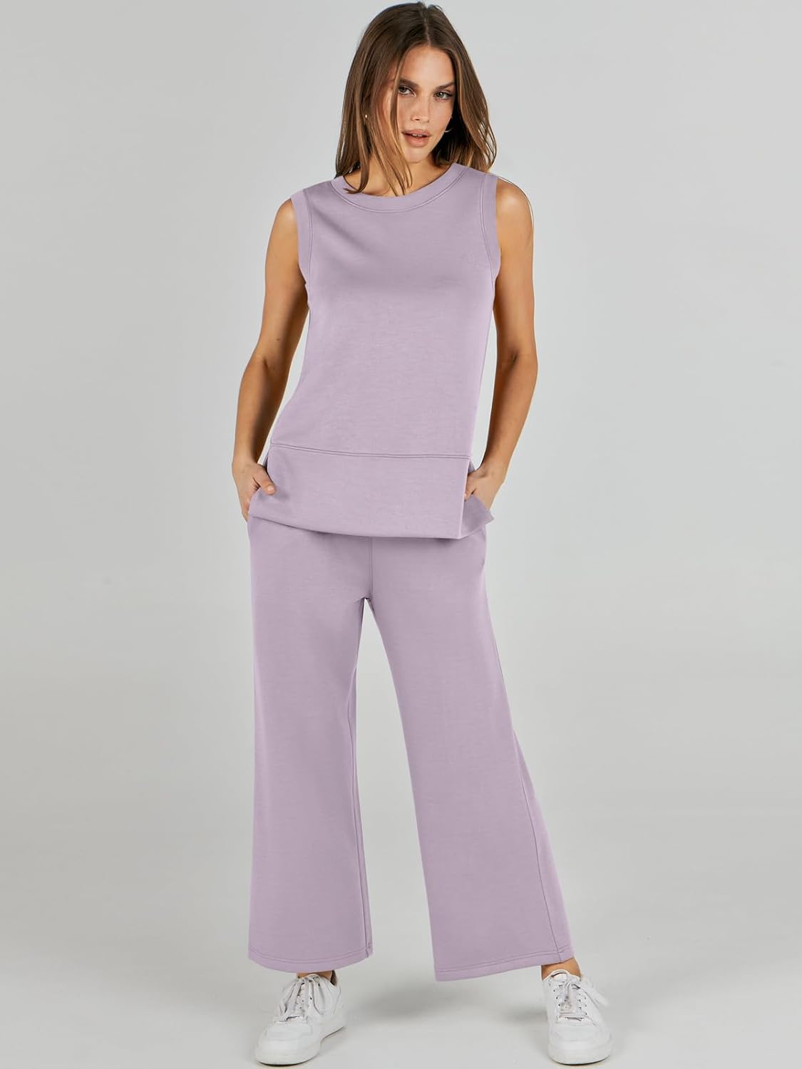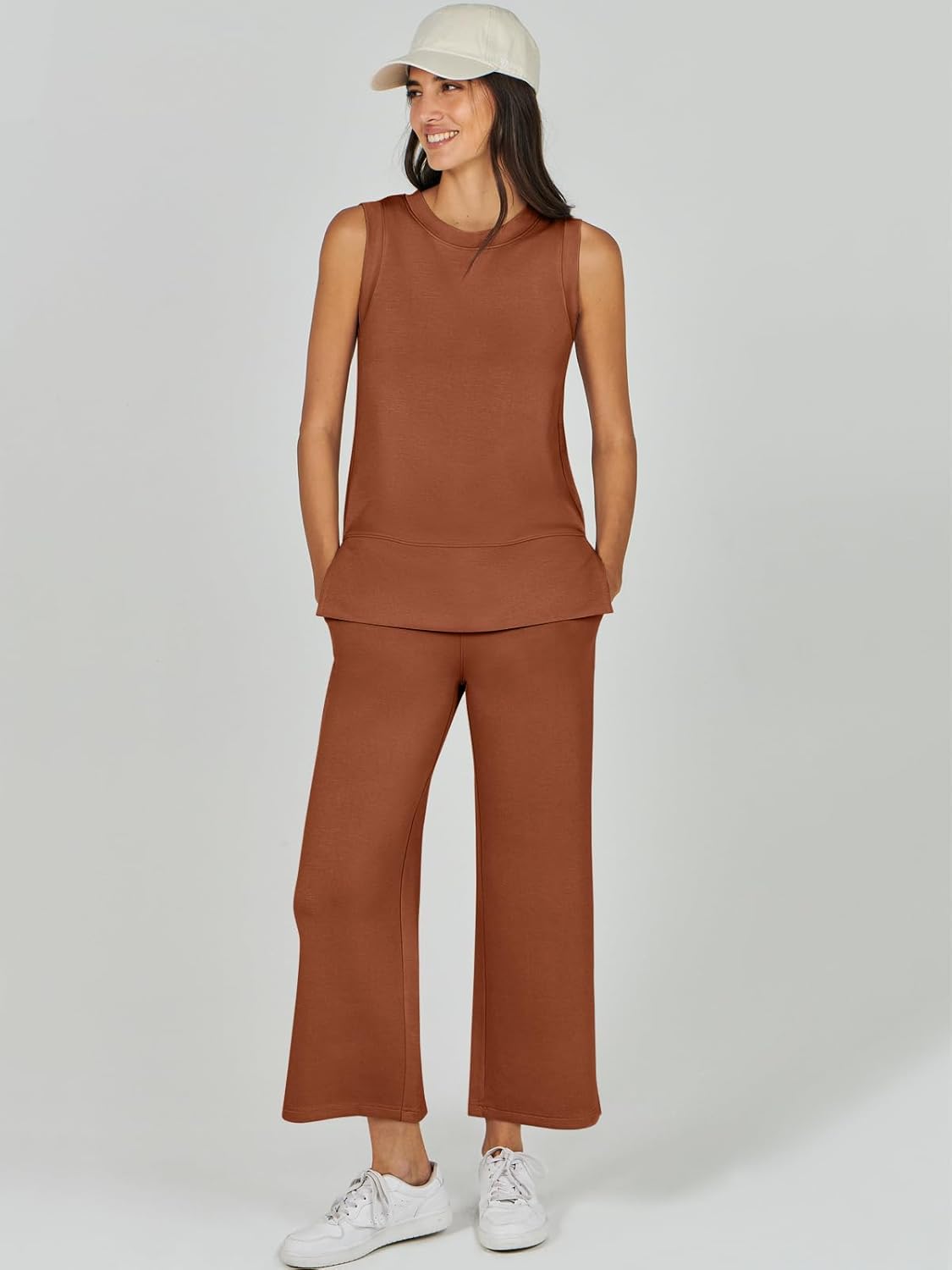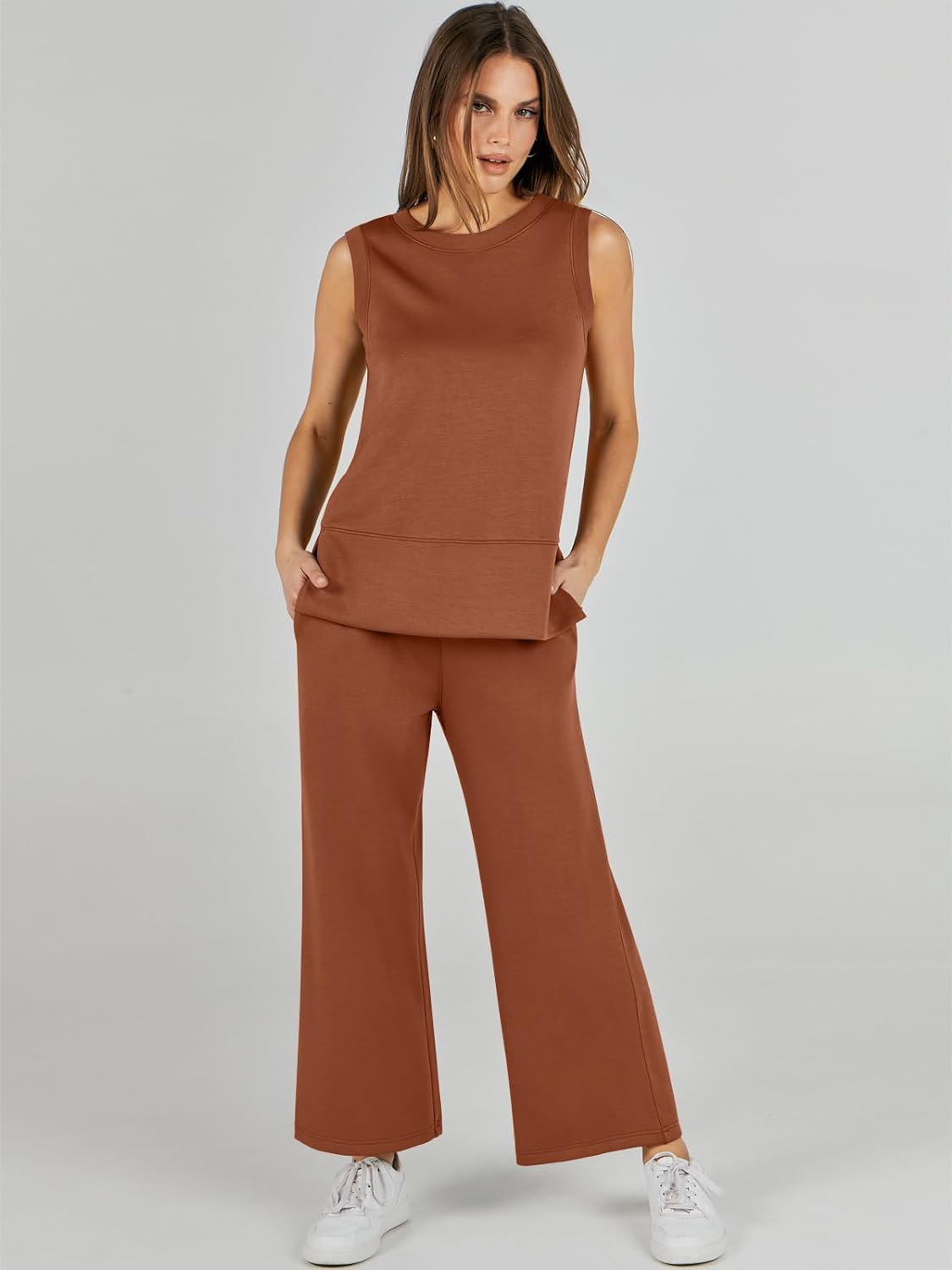 Feature --- Crewneck / Sleeveless / High Waist / Drawstring/ Wide Leg