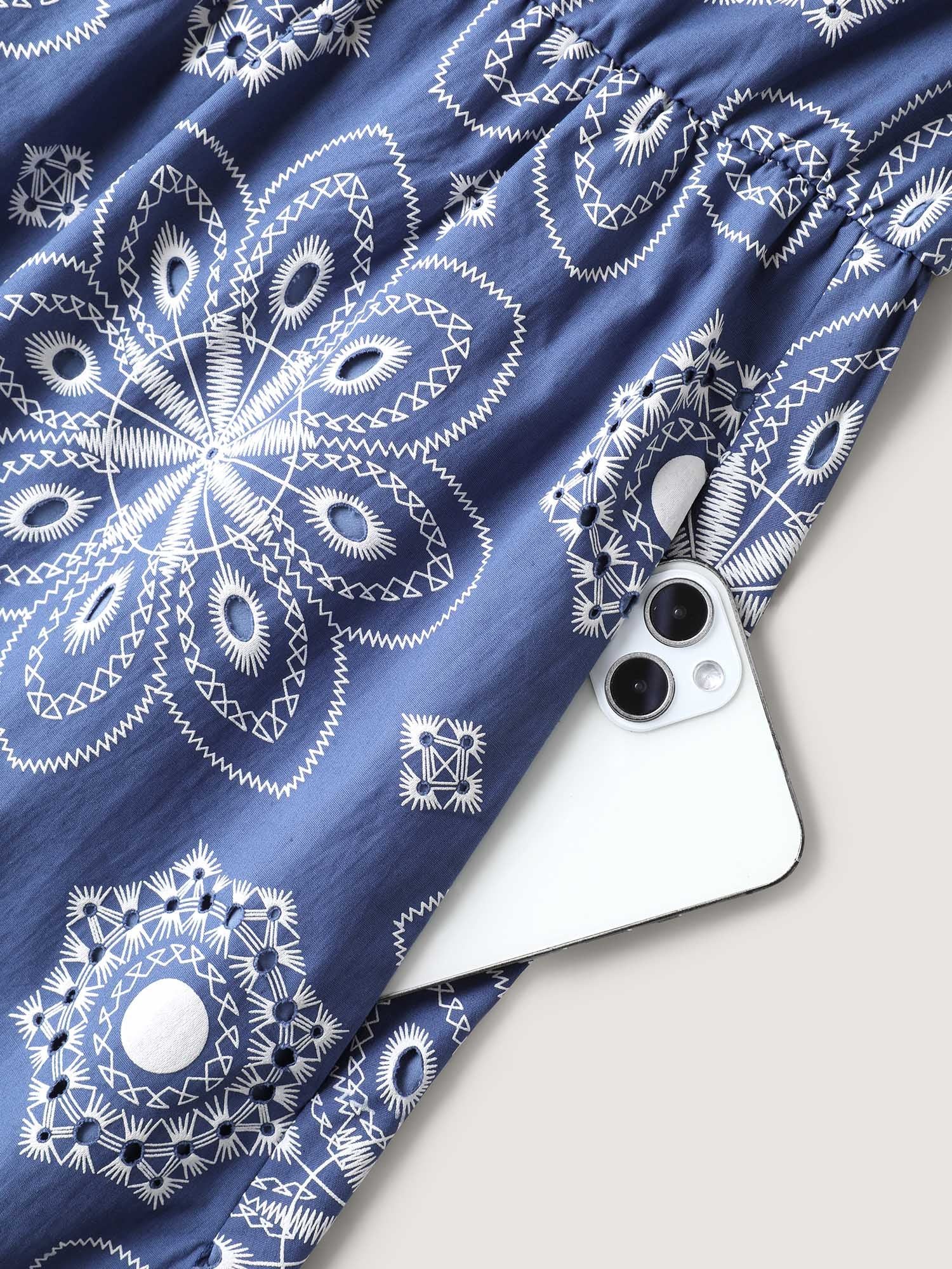 Cotton Large Floral Print Textured Pockets Midi Dress
