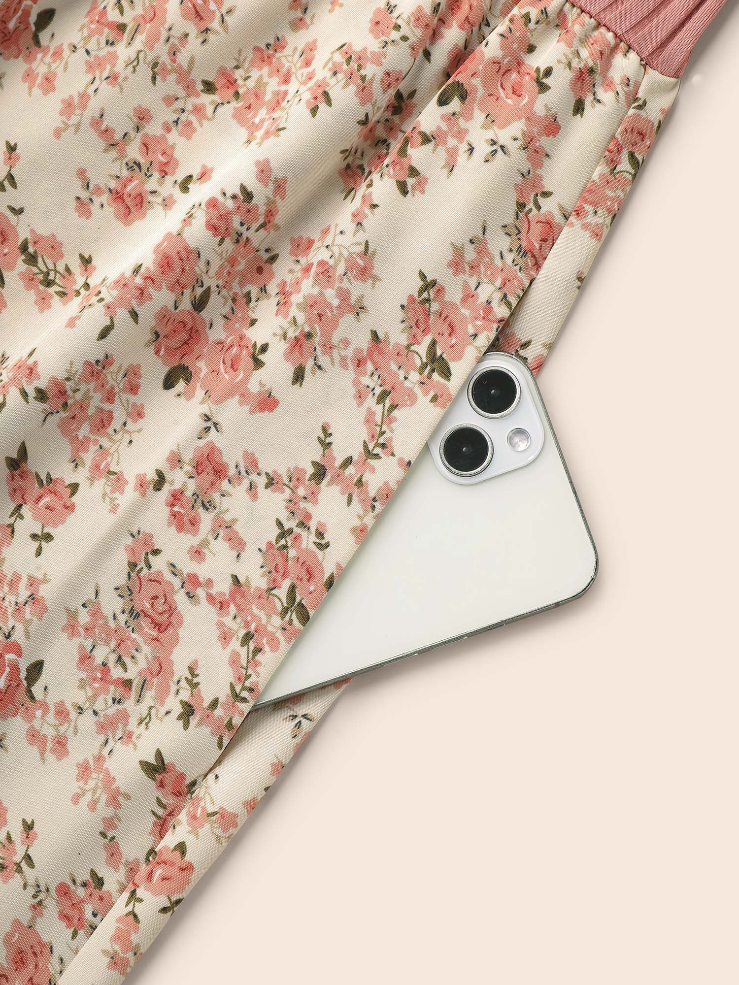 Floral Color Contrast Ribbed Pockets Maxi Dress