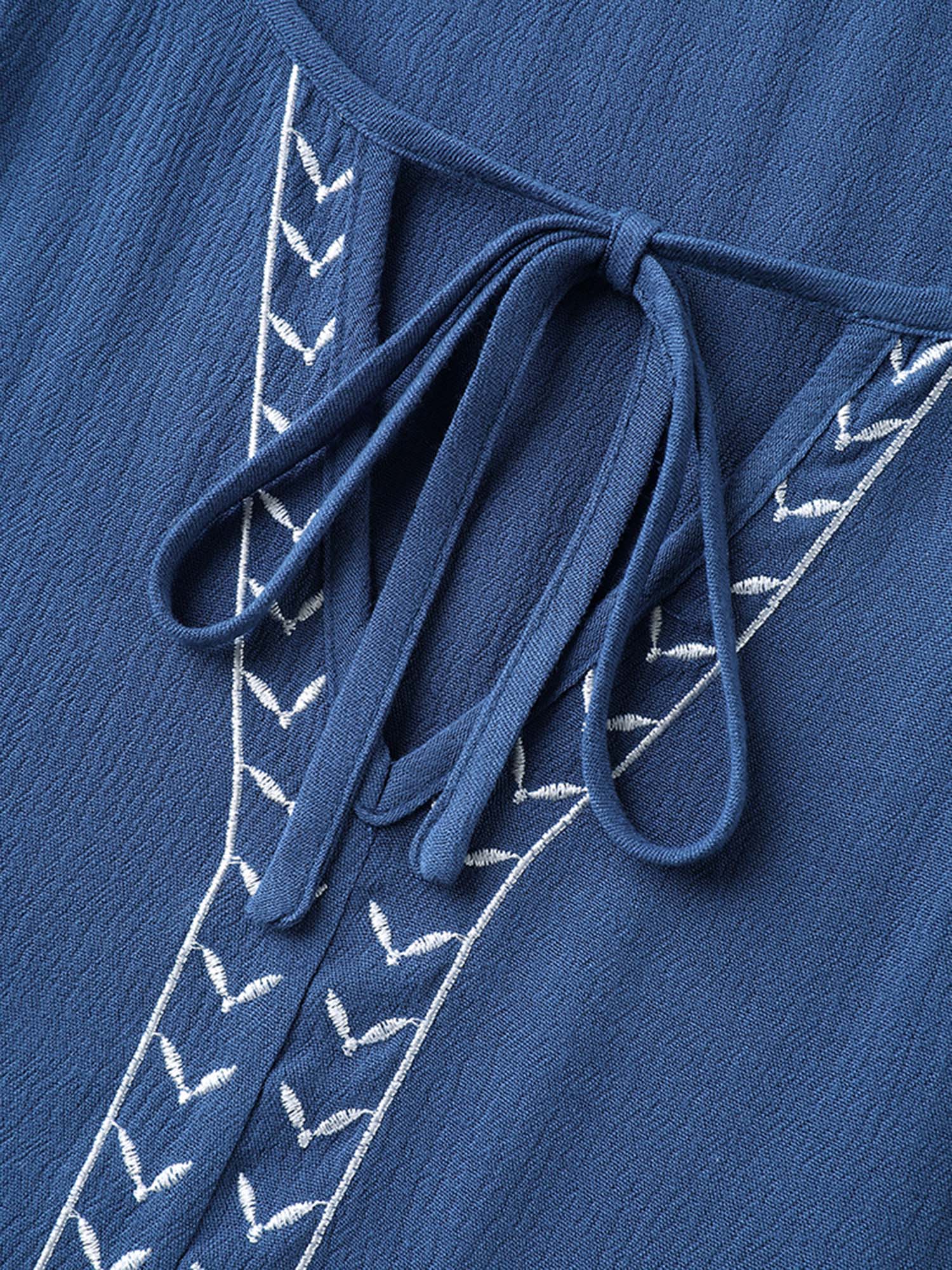 Floral Embroidery Textured Neck Tie Blouse