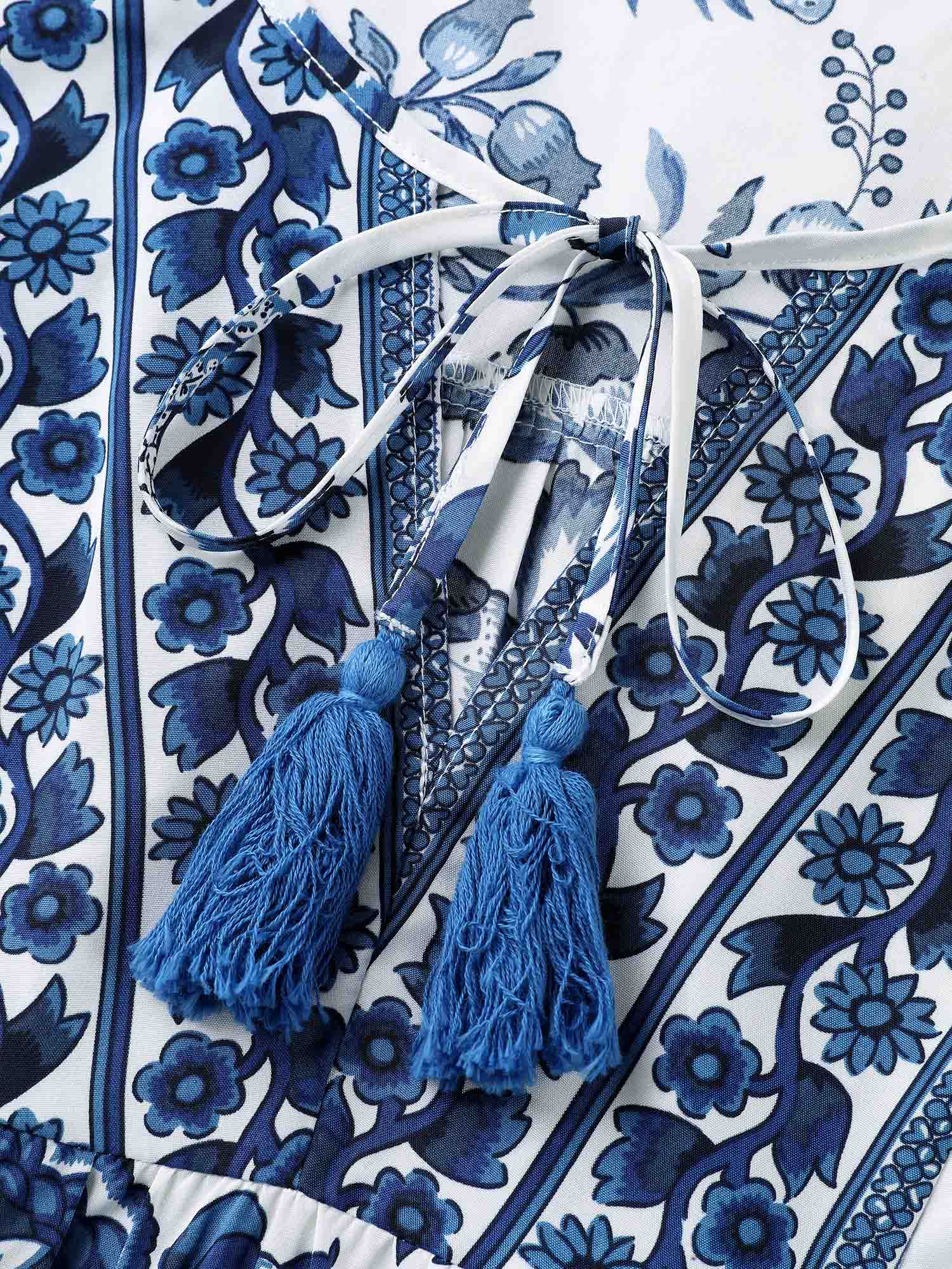 Floral Print Neck Tassels Blouse