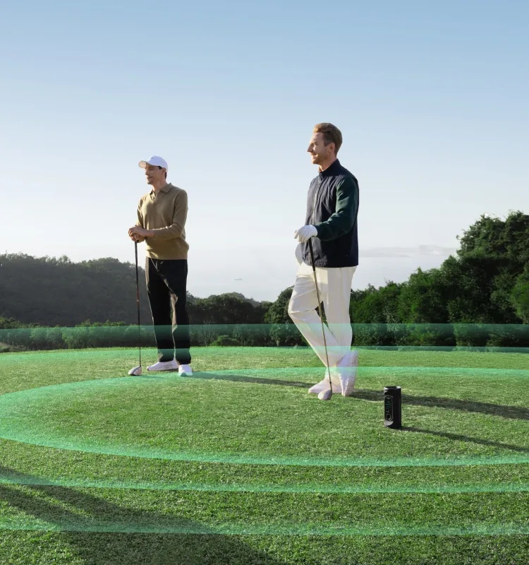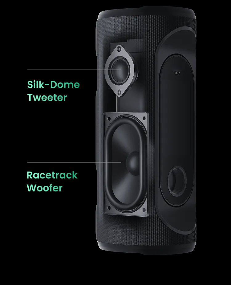 Engineered with a dual-band crossover system, a silk-dome tweeter, a racetrack woofer, and dual passive radiators, this speaker delivers tuneful, immersive sound. From crisp highs and warm mids to deep resonant bass, every detail comes alive—whether on the fairway, at home, or partying with friends.