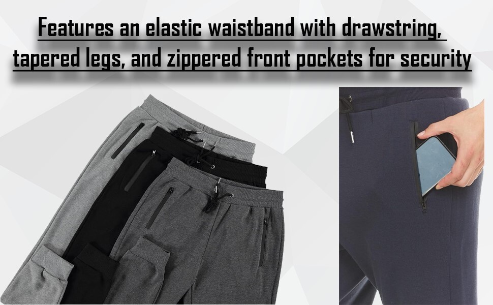 - Features an elastic waistband with drawstring, tapered legs, and zippered front pockets for security
