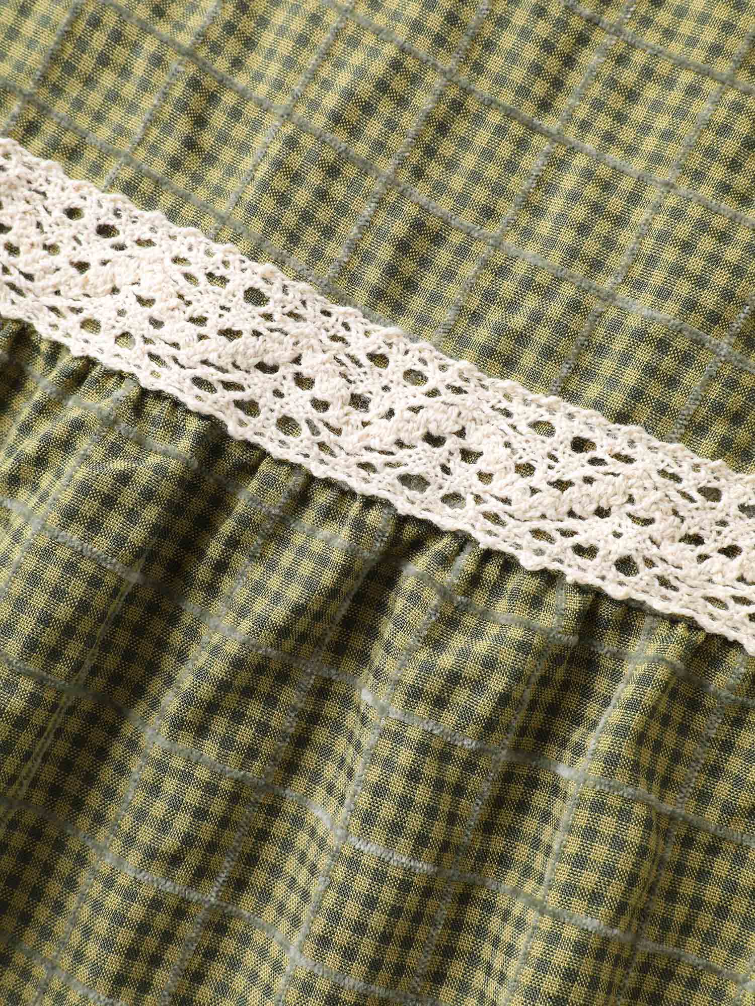 Plaid Shirred Lace Trim Tiered Maxi Dress