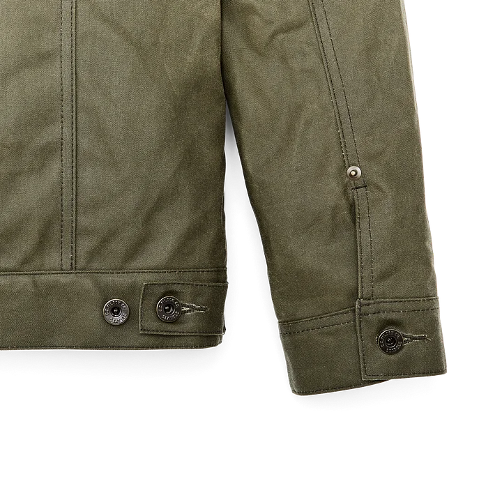 Our Short Lined Cruiser Jacket is made with Tin Cloth, our signature waxed cotton that has protected foresters and outdoorsmen from weather, brambles, and abrasion for a century. Its durable weather resistance is unequaled. Our waxed-cotton Tin Cloth from England's historic British Millerain weighs 14 ounces per square yard, twice the weight of most imitators. Its uncommonly tight weave delivers outstanding tear strength and improved water resistance. Like heavy-duty denim, Tin Cloth breaks in and molds to the body's contours and flex patterns.