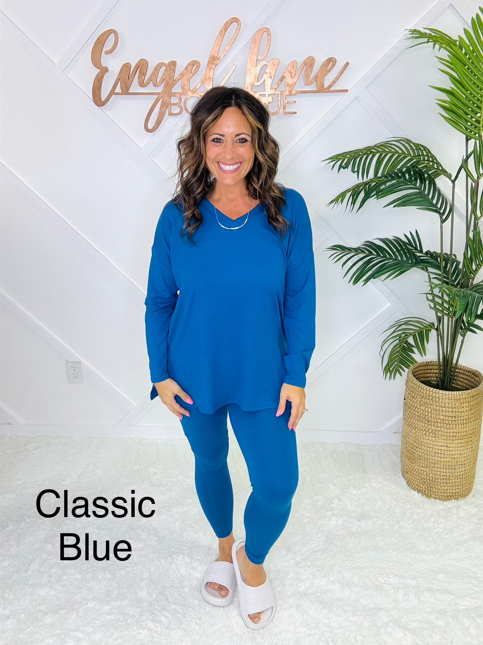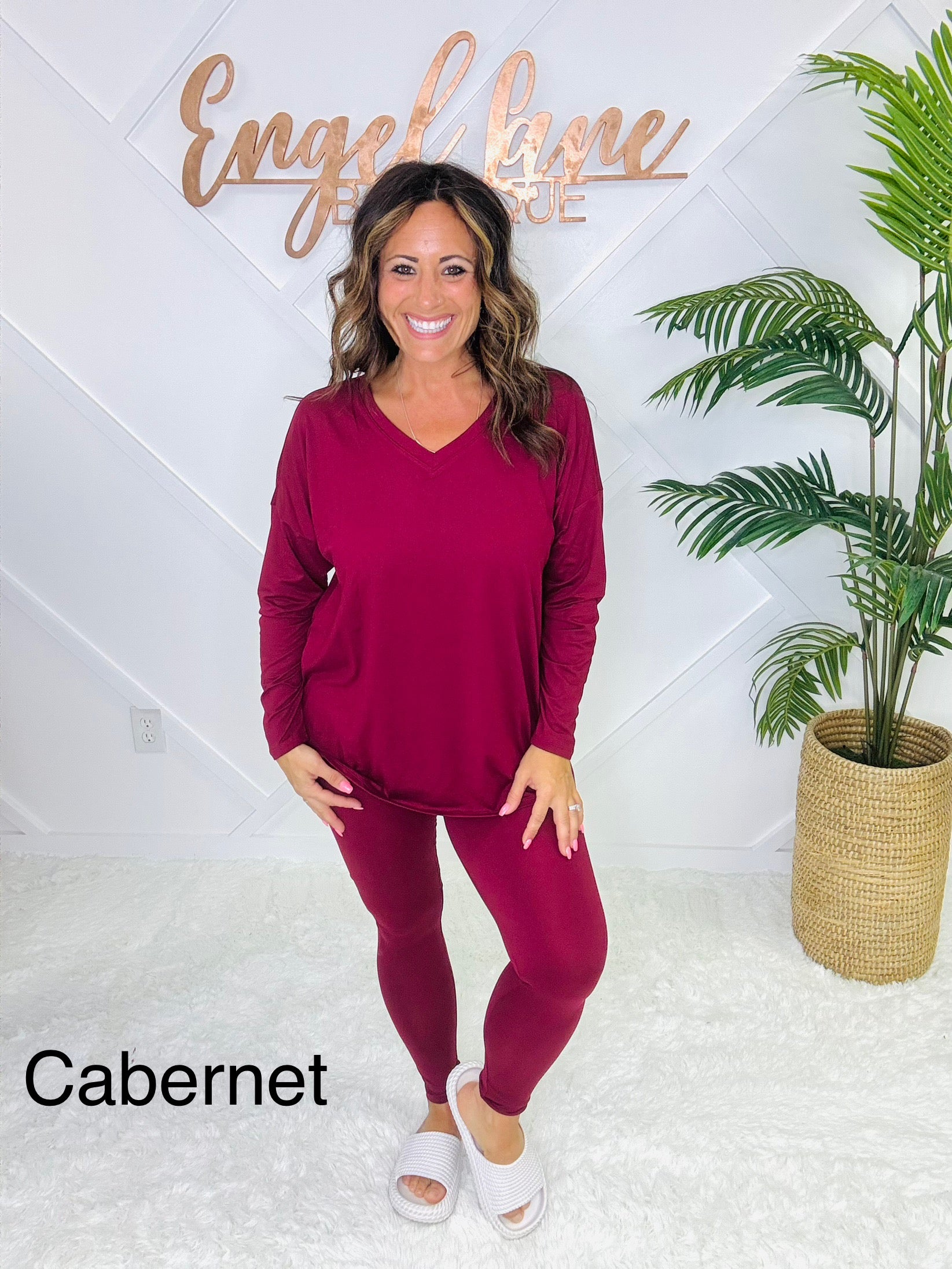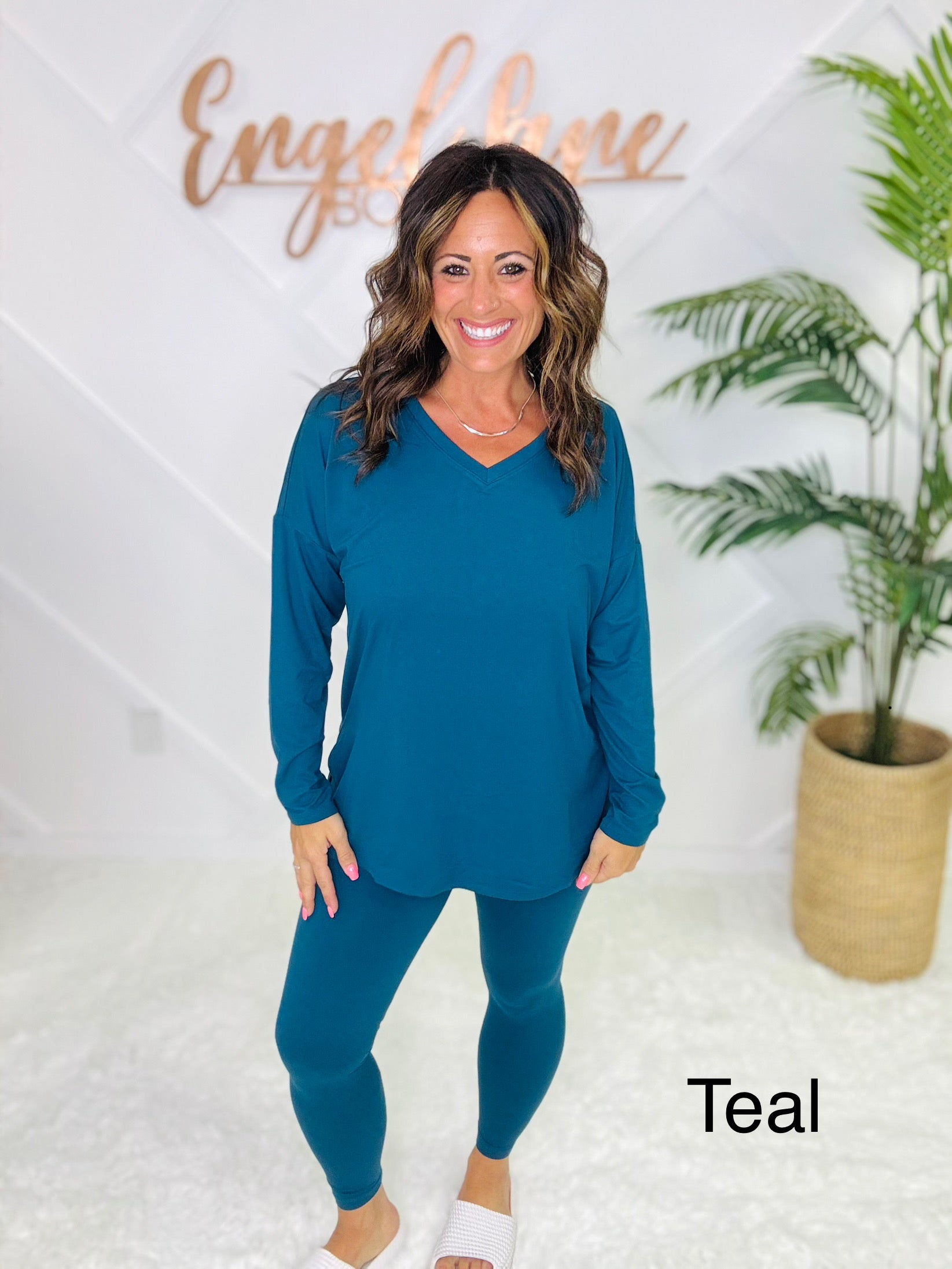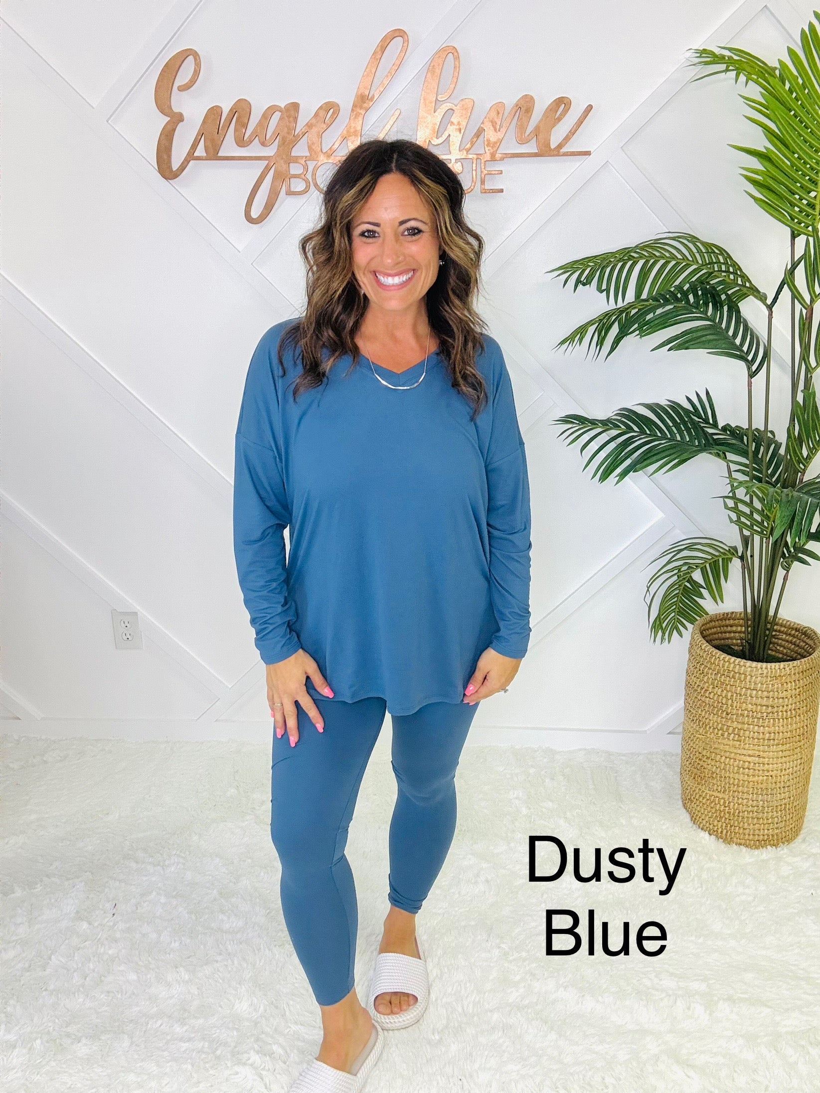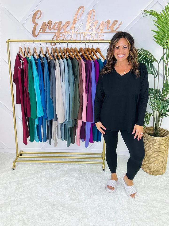 Meet your new go-to set for cozy days and casual outings. This matching two-piece lounge set features an oversized long sleeve top with a flattering V-neckline, side slits, and a flowy fit that drapes effortlessly. Paired with matching high-stretch leggings, this set combines comfort and style in one easy outfit.