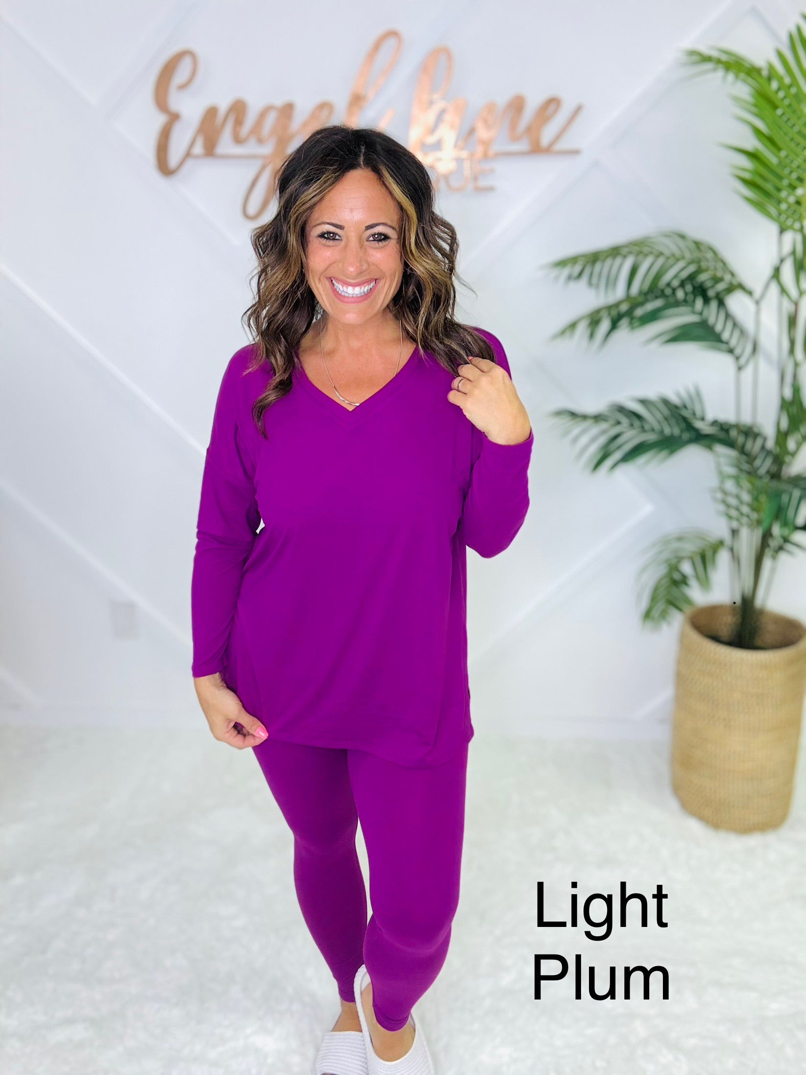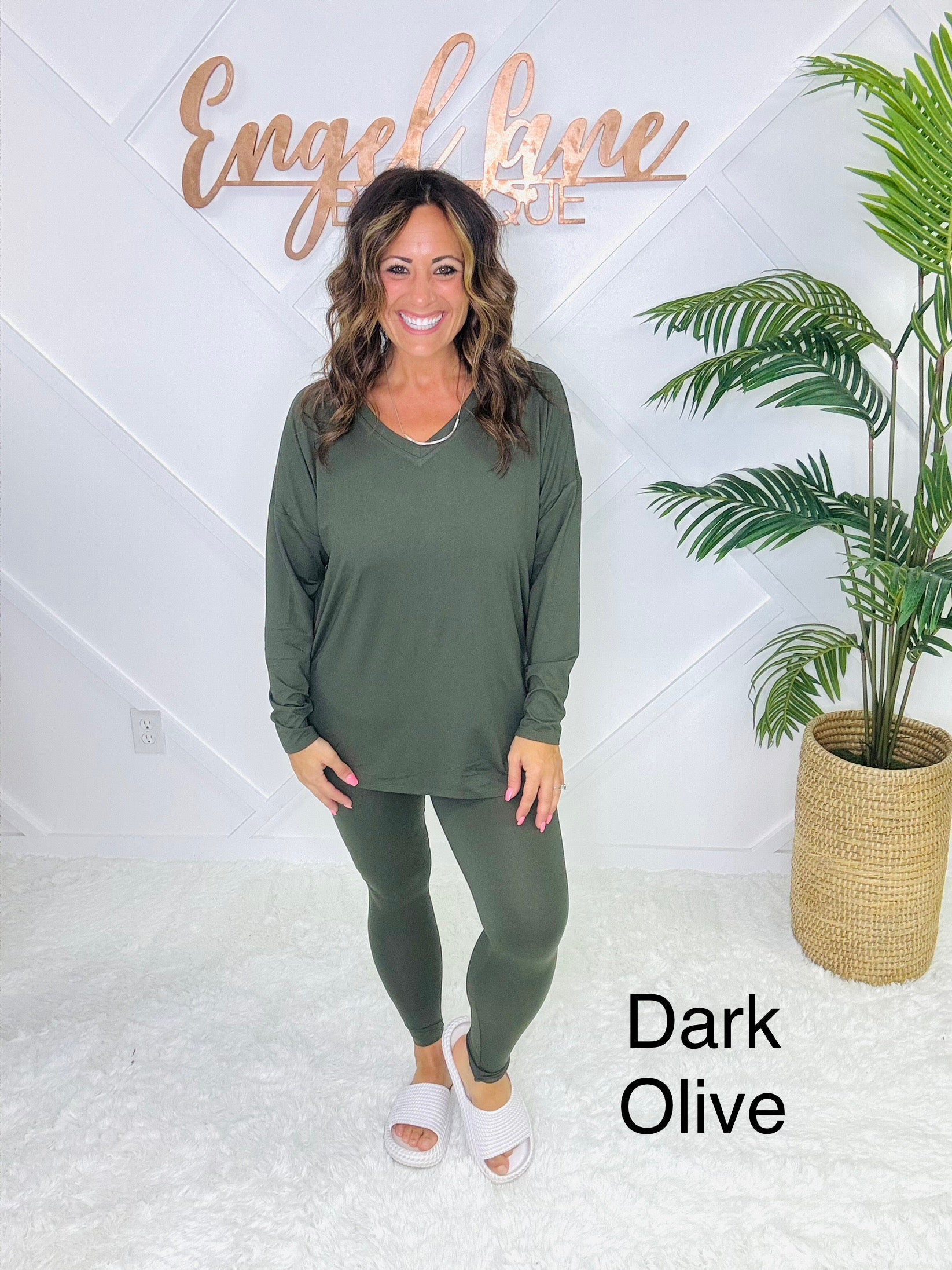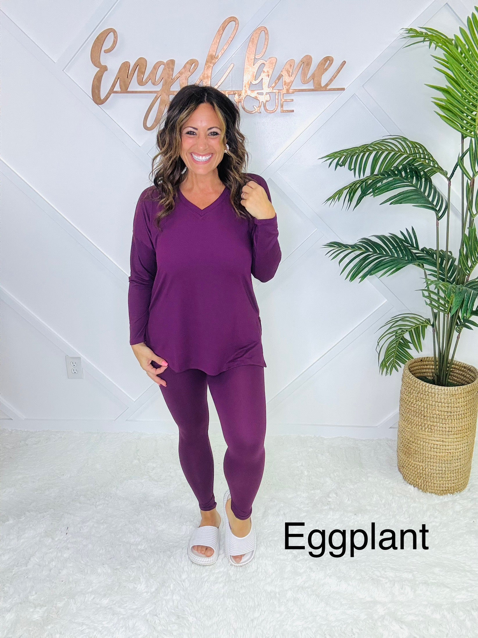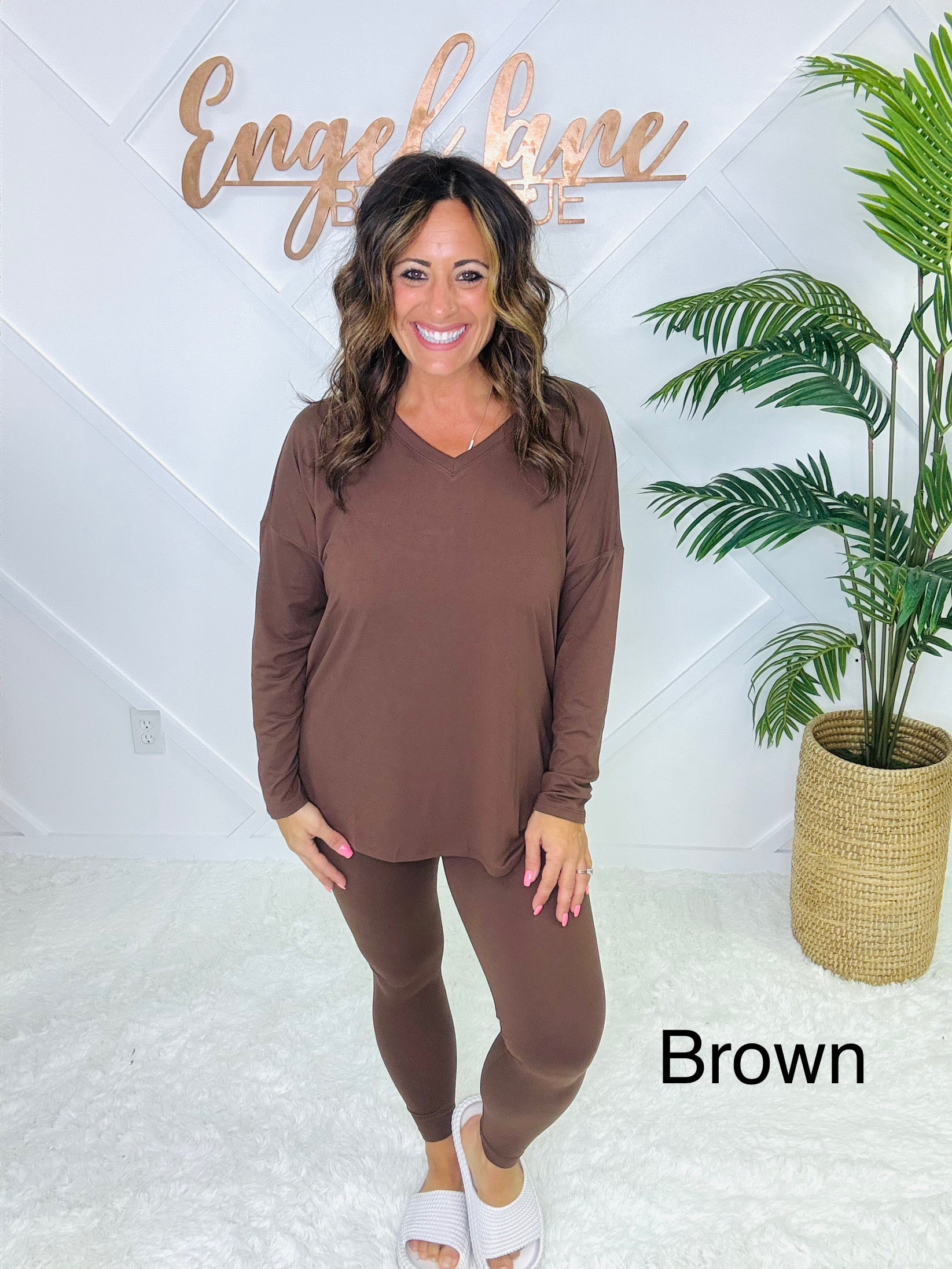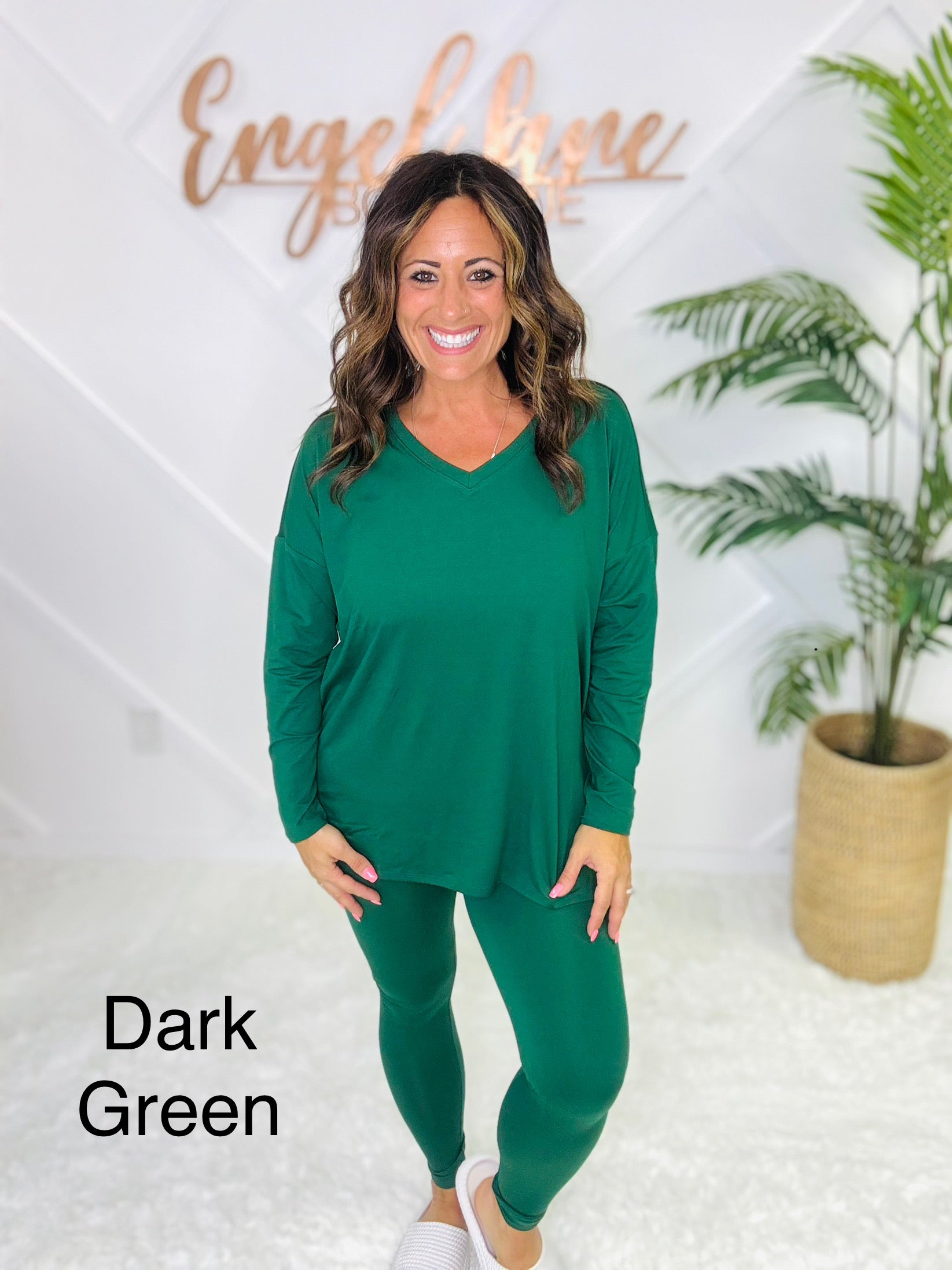 Meet your new go-to set for cozy days and casual outings. This matching two-piece lounge set features an oversized long sleeve top with a flattering V-neckline, side slits, and a flowy fit that drapes effortlessly. Paired with matching high-stretch leggings, this set combines comfort and style in one easy outfit.