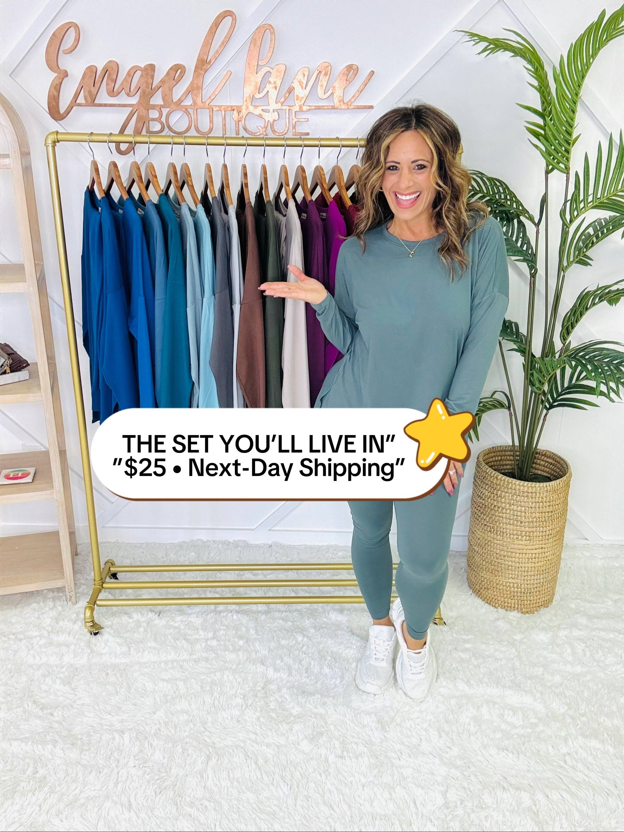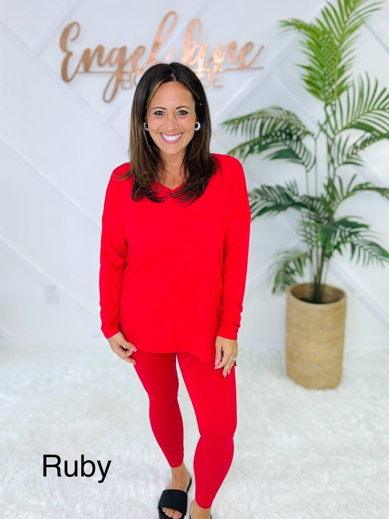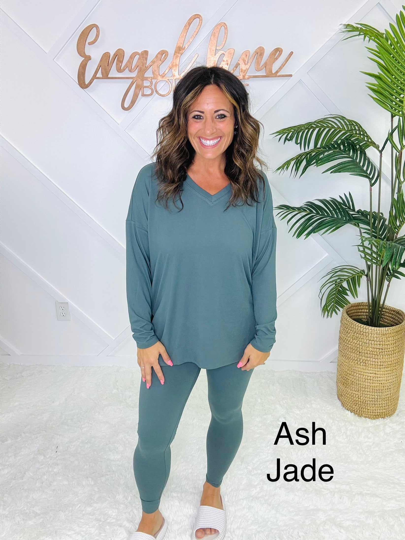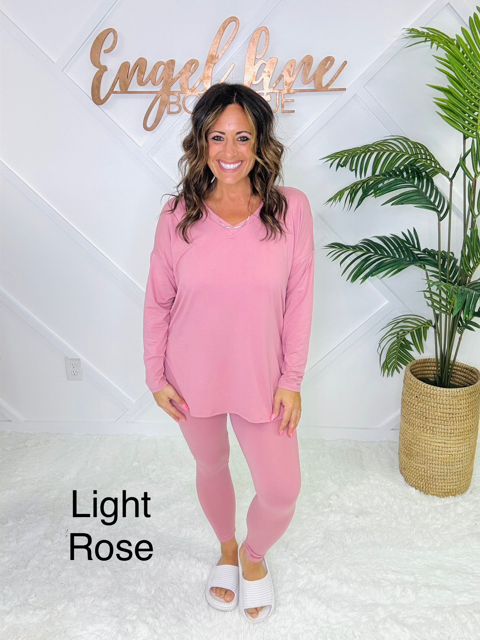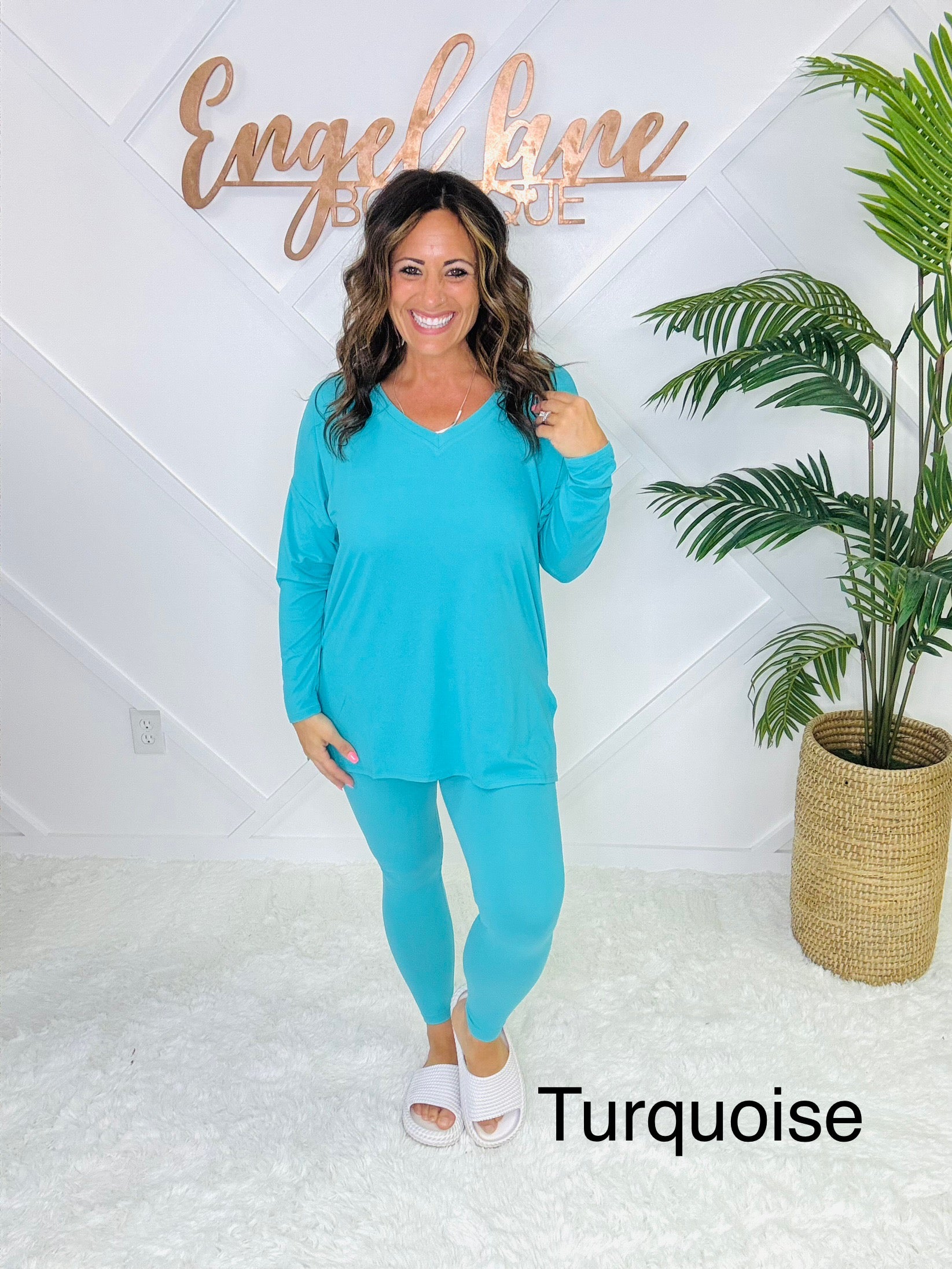 Meet your new go-to set for cozy days and casual outings. This matching two-piece lounge set features an oversized long sleeve top with a flattering V-neckline, side slits, and a flowy fit that drapes effortlessly. Paired with matching high-stretch leggings, this set combines comfort and style in one easy outfit.